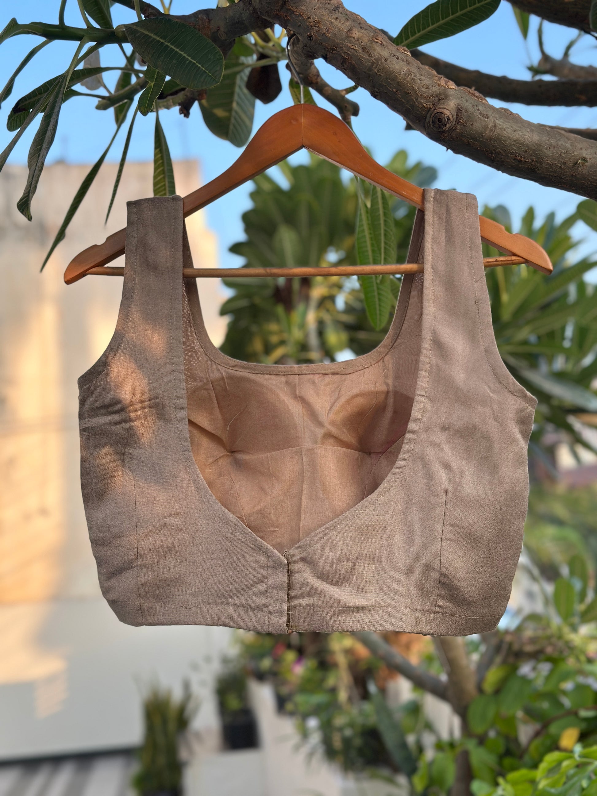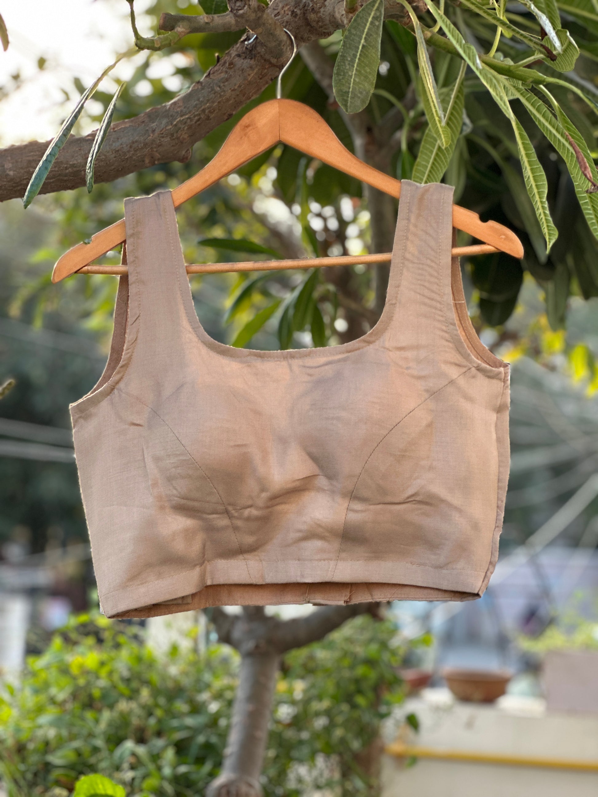 The Aanchal is a brownish beige cotton blouse with a U-neck and sleeveless design, ideal for everyday wear. It comes with padded support that can be removed for comfort and versatility.