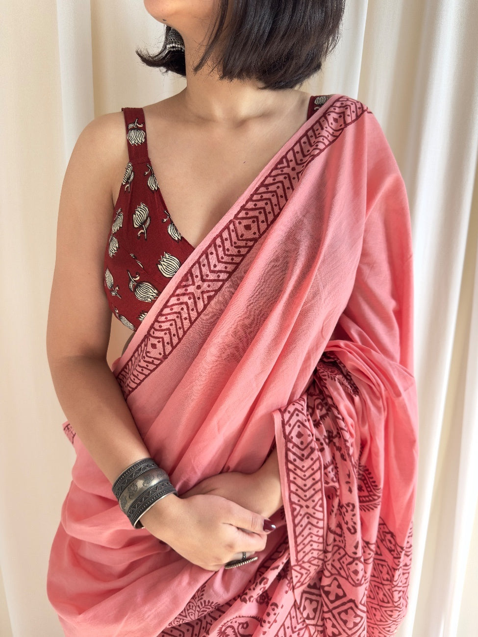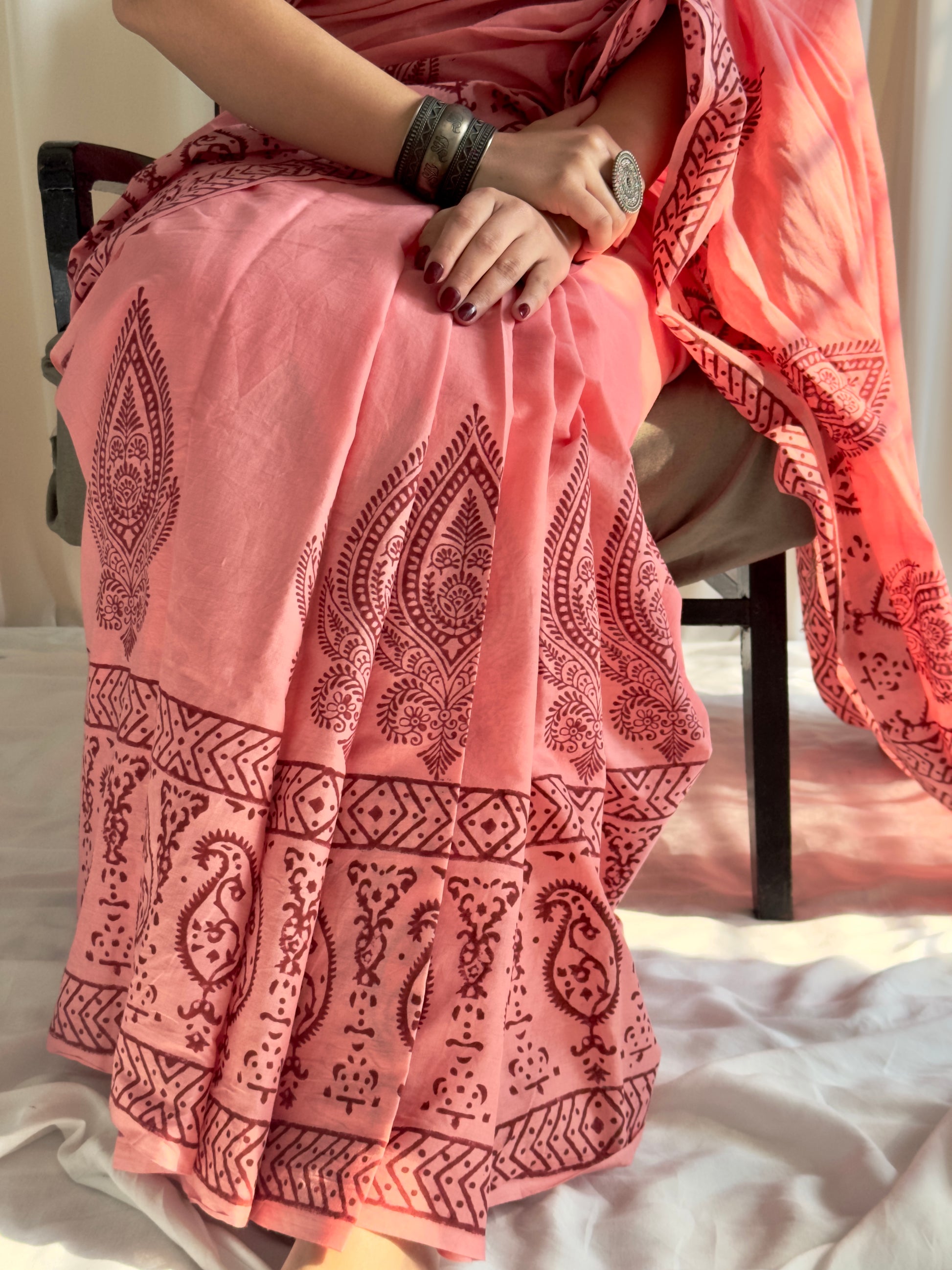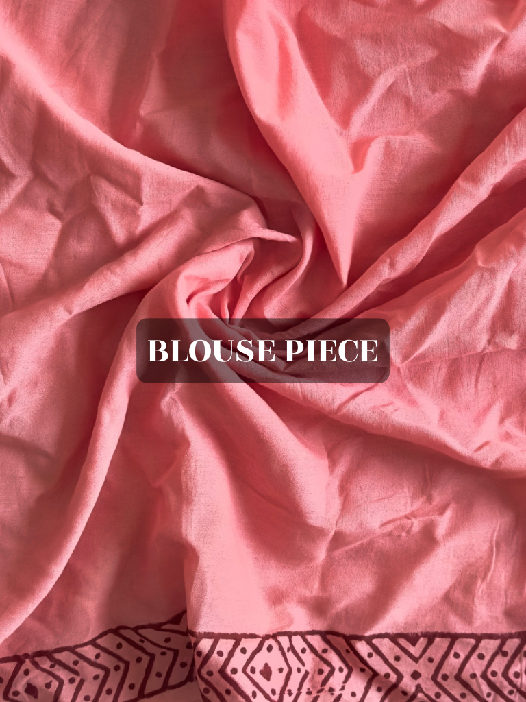Hand block printed pink mulmul saree