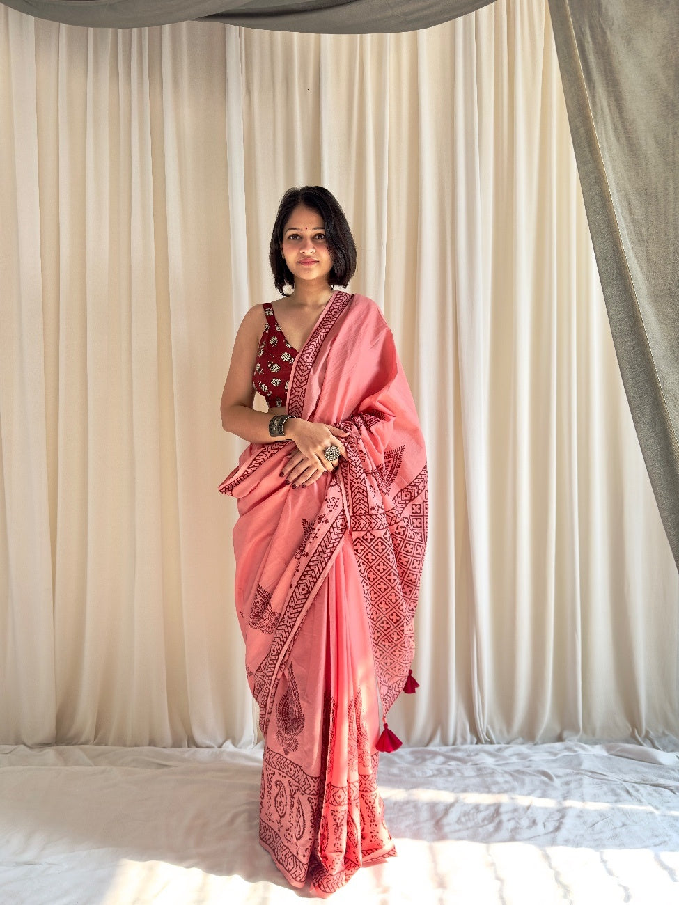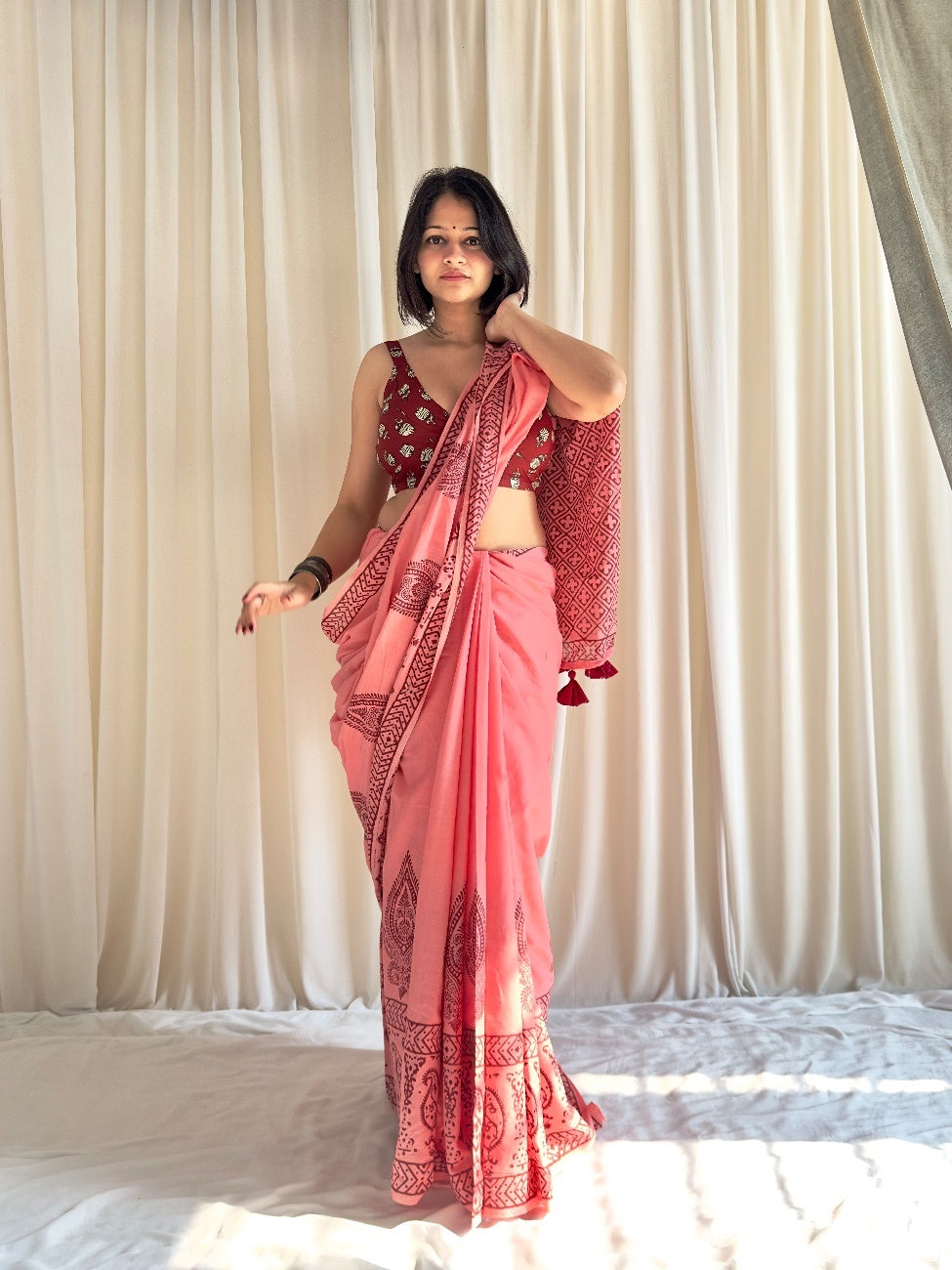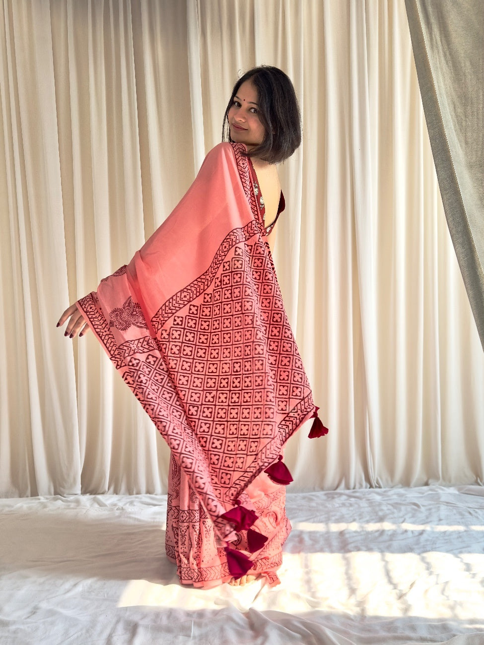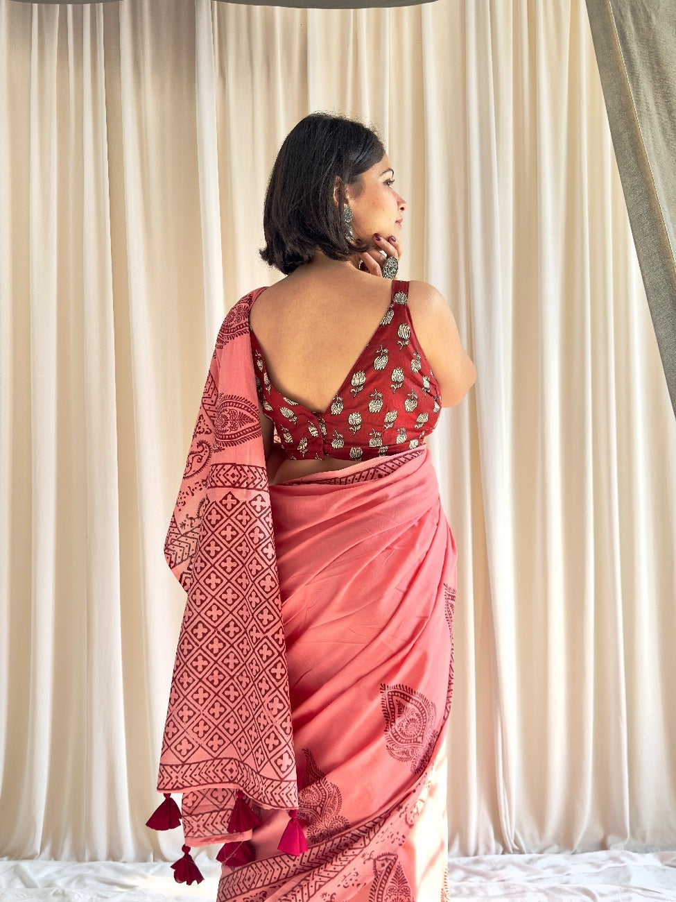 Looking for something that's one-of-a-kind, classy, stylish, and effortless to wear? Introducing Adaah: a beautifully crafted peachy pink saree with Mughal print . Made from soft mul mul cotton, this saree is perfect for any occasion. Adorned with premium pure cotton tassels on the pallu, Addah is sure to make you stand out.