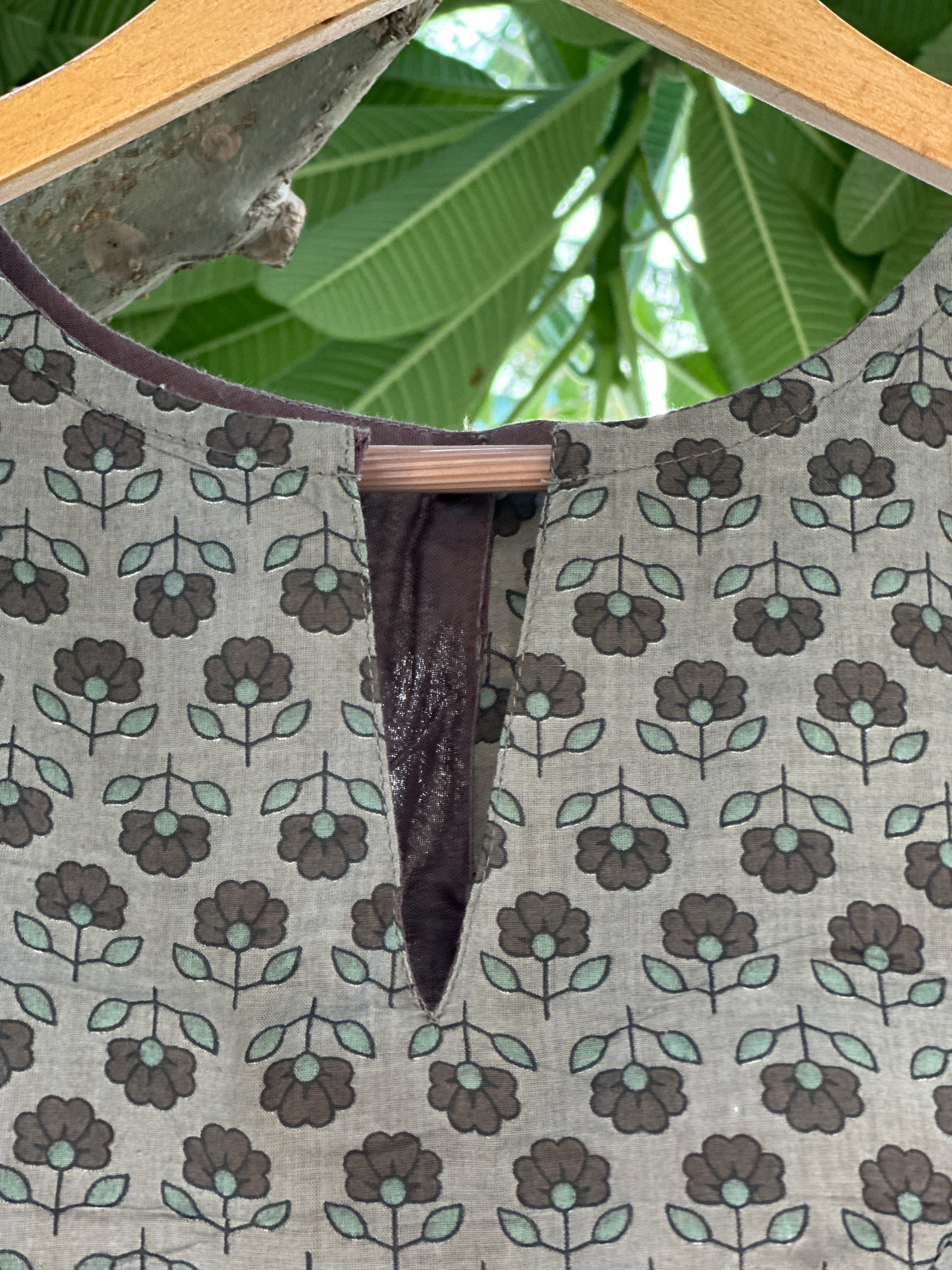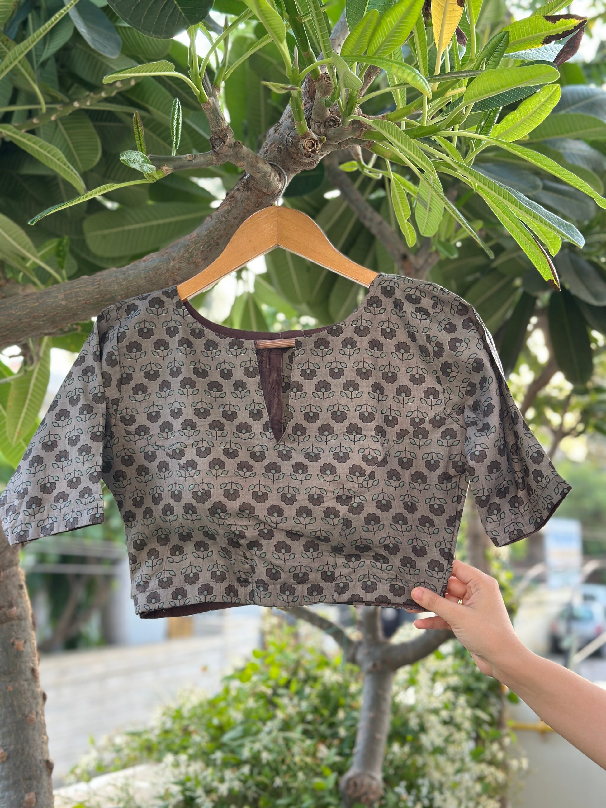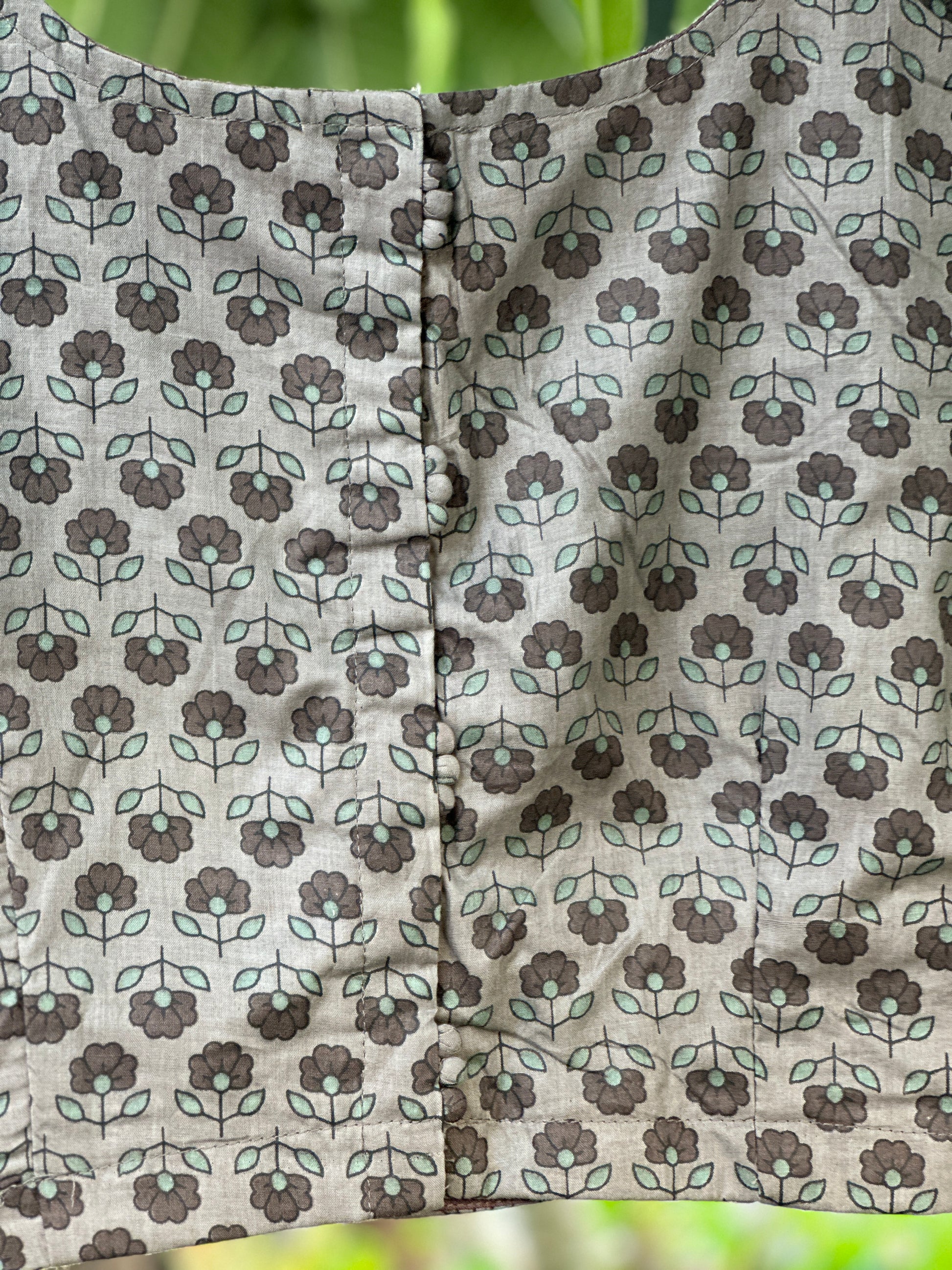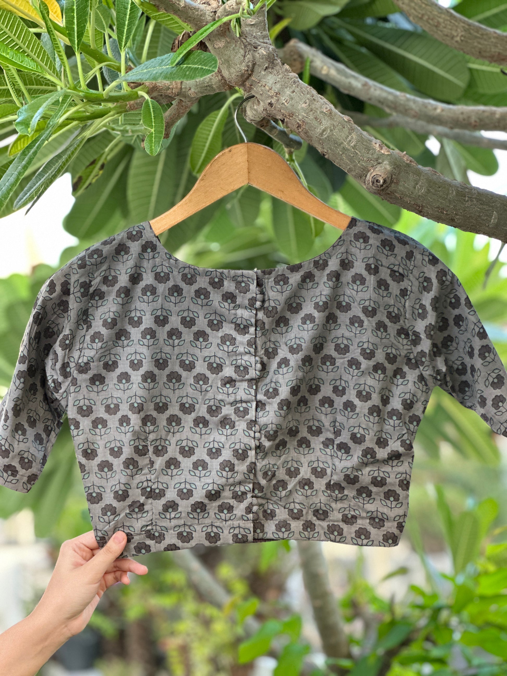 Basera - a classic hand-block printed blouse in earthy grey tones, adorned with delicate floral motifs. Crafted in breathable cotton, it’s designed for everyday comfort while adding a touch of timeless elegance to your sarees
