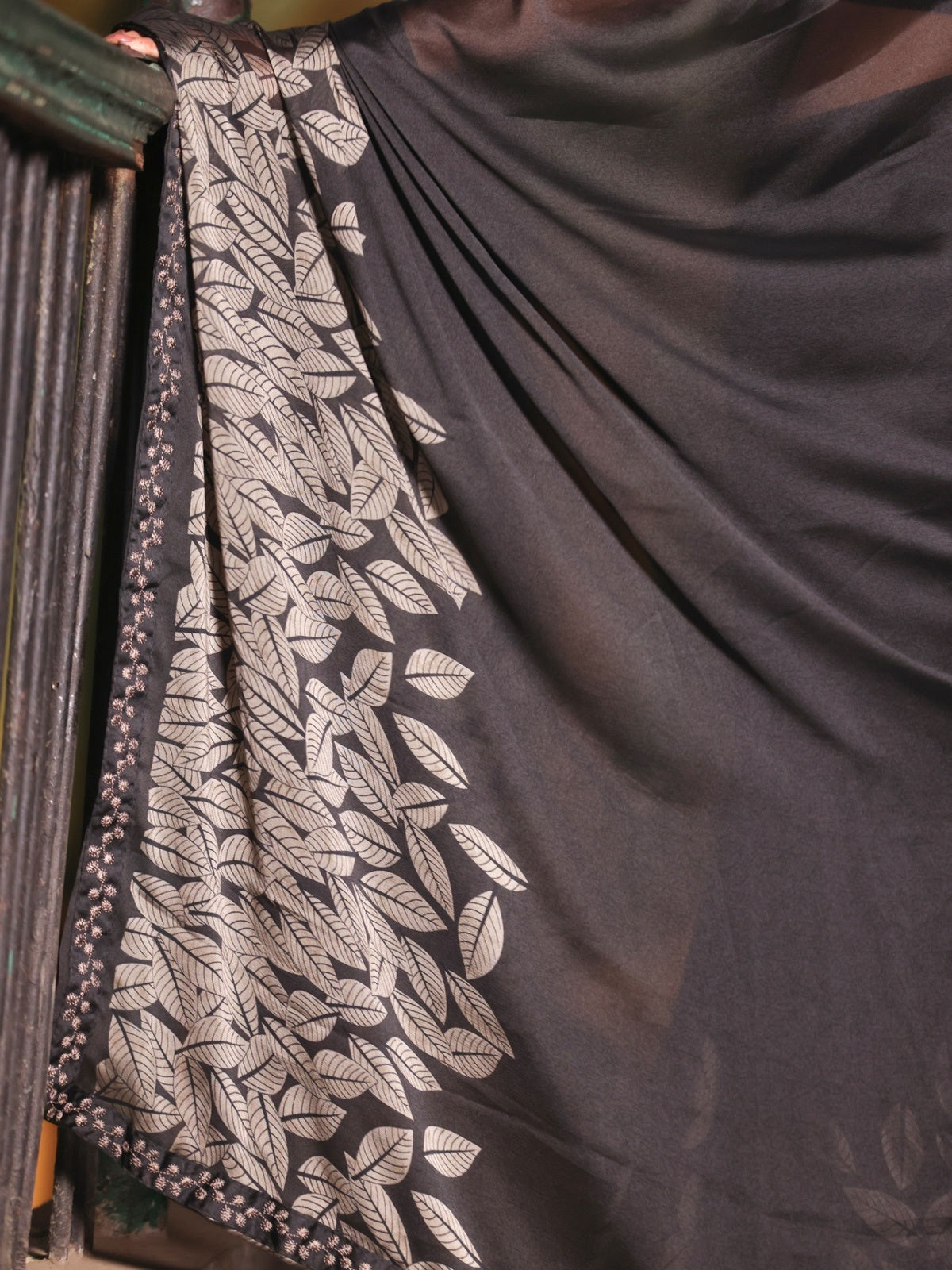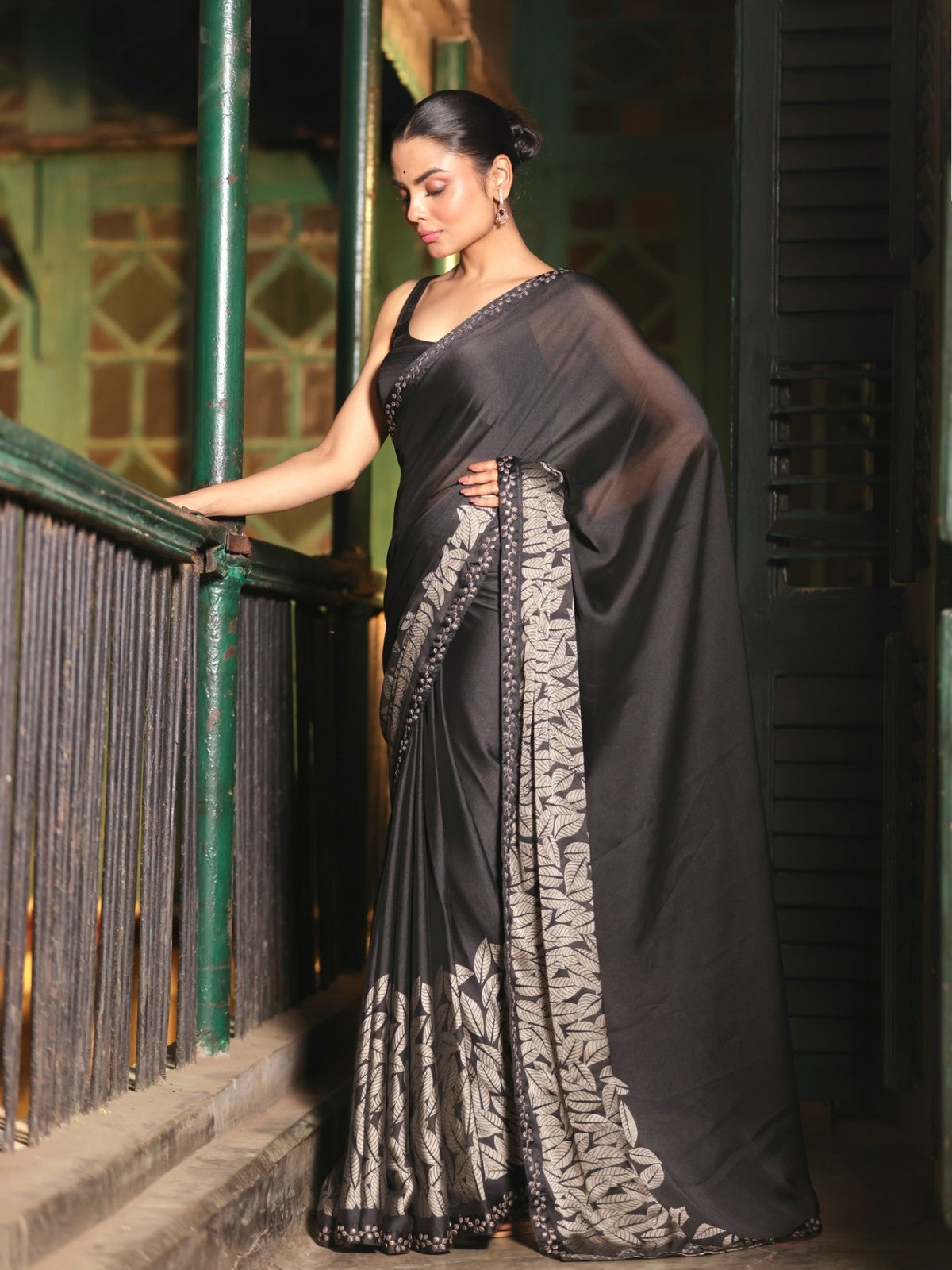 All black, but never basic. Crafted in fluid moss crepe that drapes like a second skin, this saree is elevated with an intricate embroidered border and delicate leafy detailing on the pallu. Elegant, lightweight, and endlessly versatile - it’s perfect for evening gatherings, festive nights, or when you want effortless sophistication.