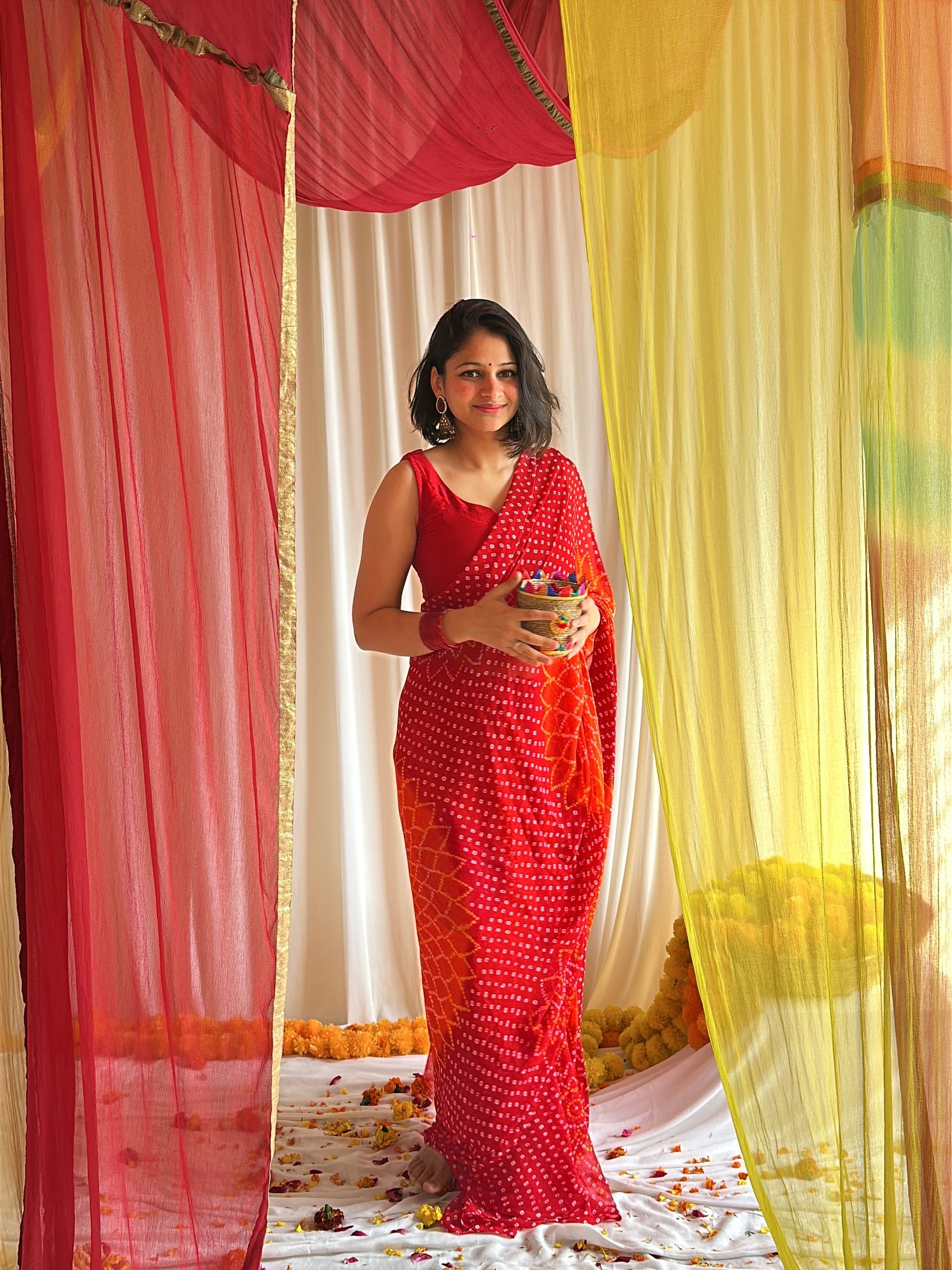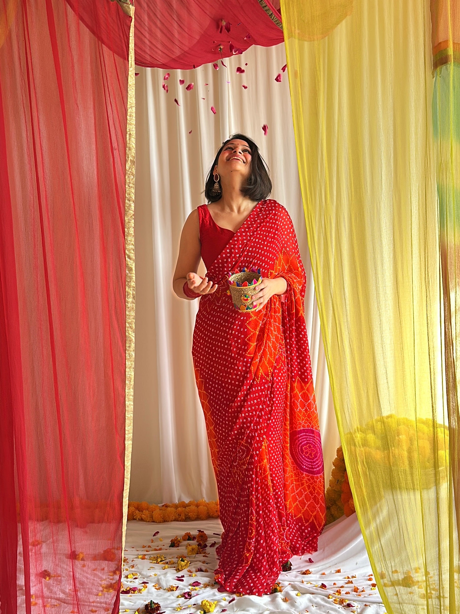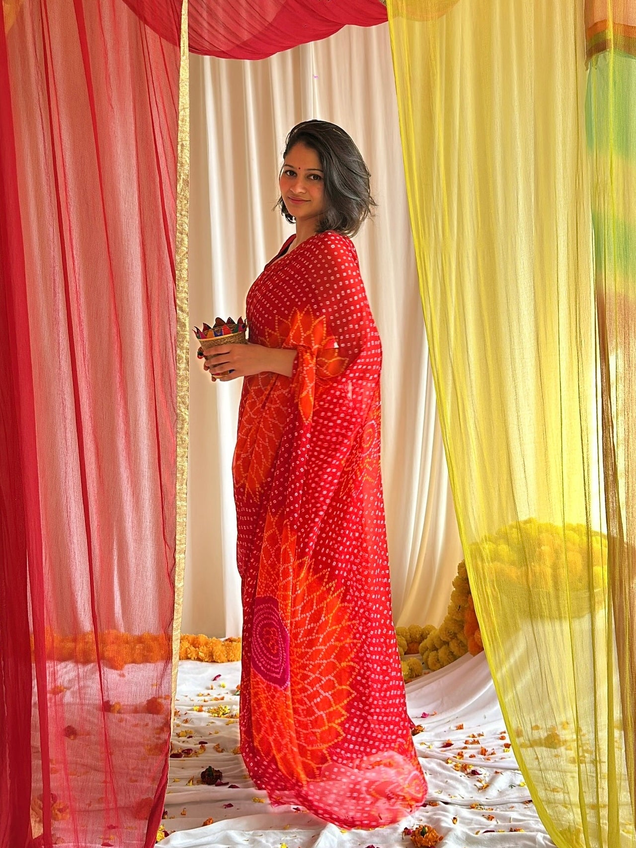 Bring on the festive glam with our bright georgette bandhej saree! ✨