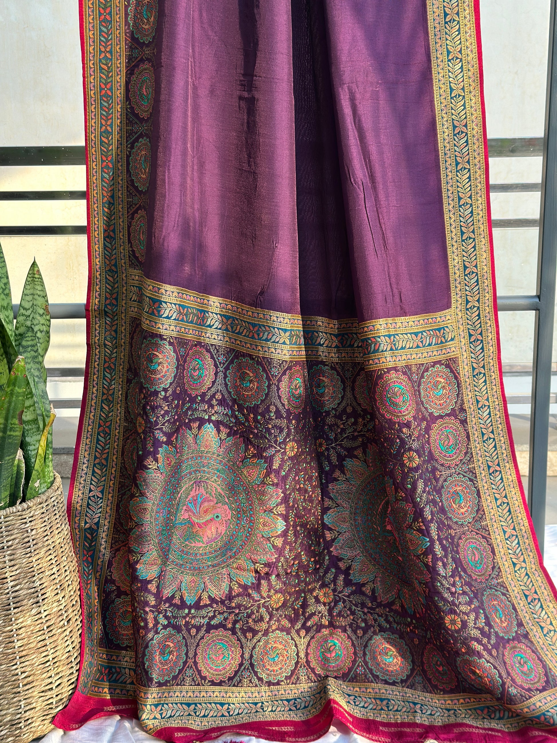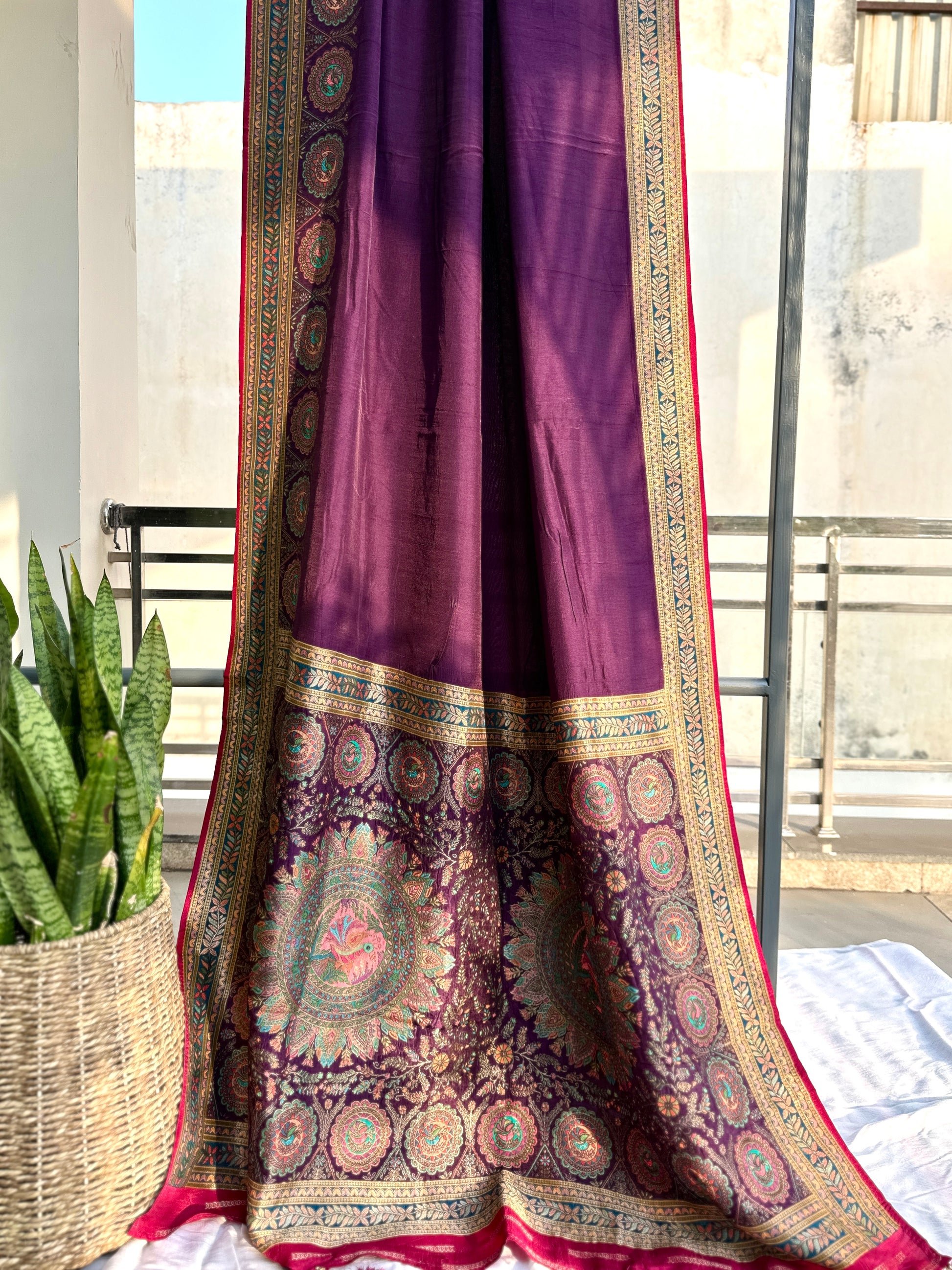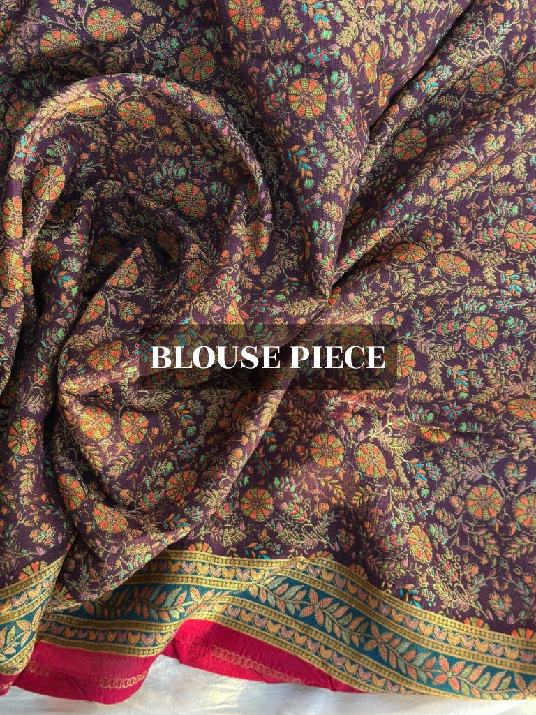 Rich purple meets intricate Kashmiri carving patterns in this premium Dola Silk saree, designed for effortless elegance. Its lightweight fabric and natural sheen enhance every movement, making it perfect for weddings, gatherings, and festive nights. A statement piece inspired by heritage yet tailored for today’s fashion.