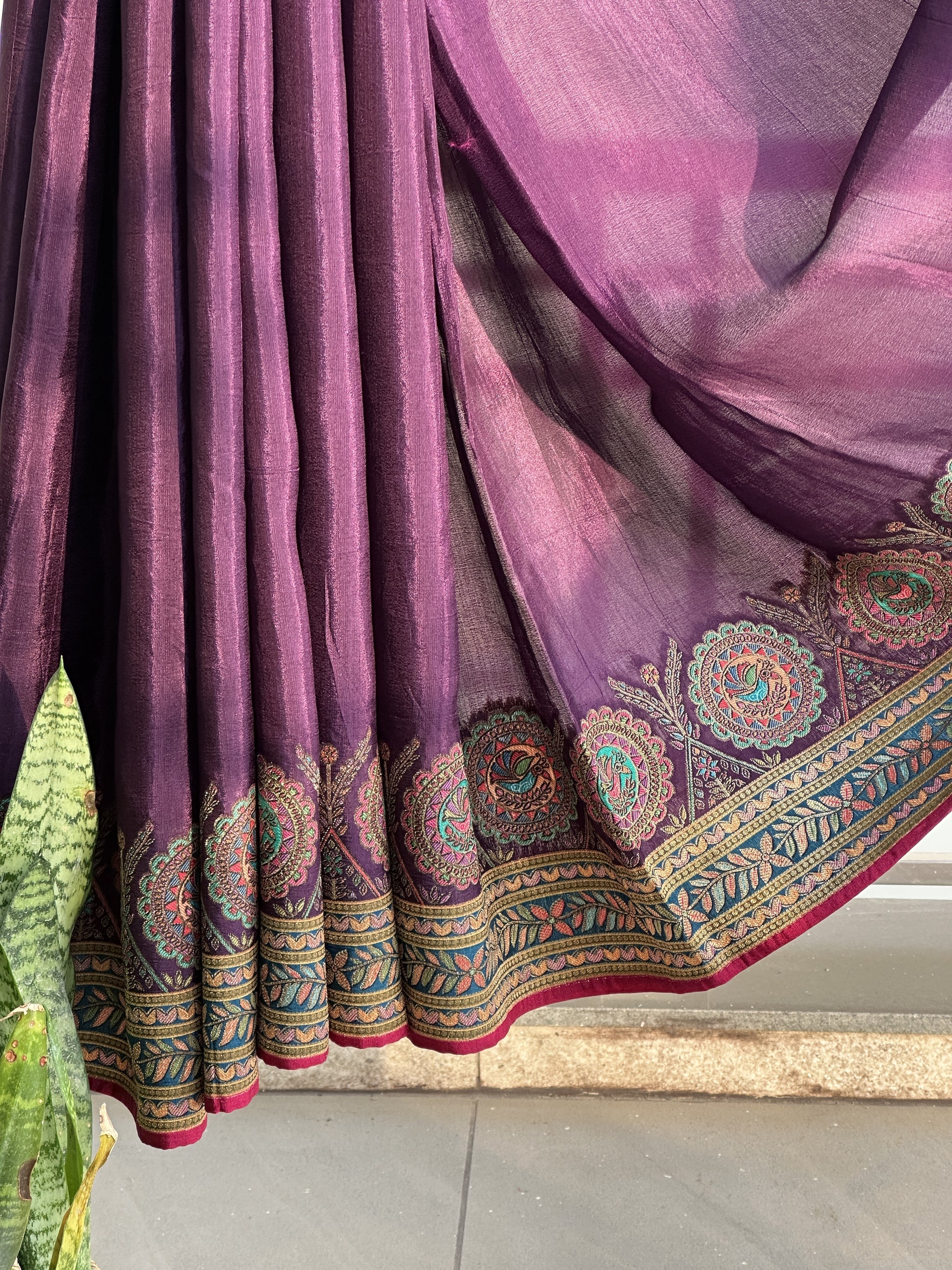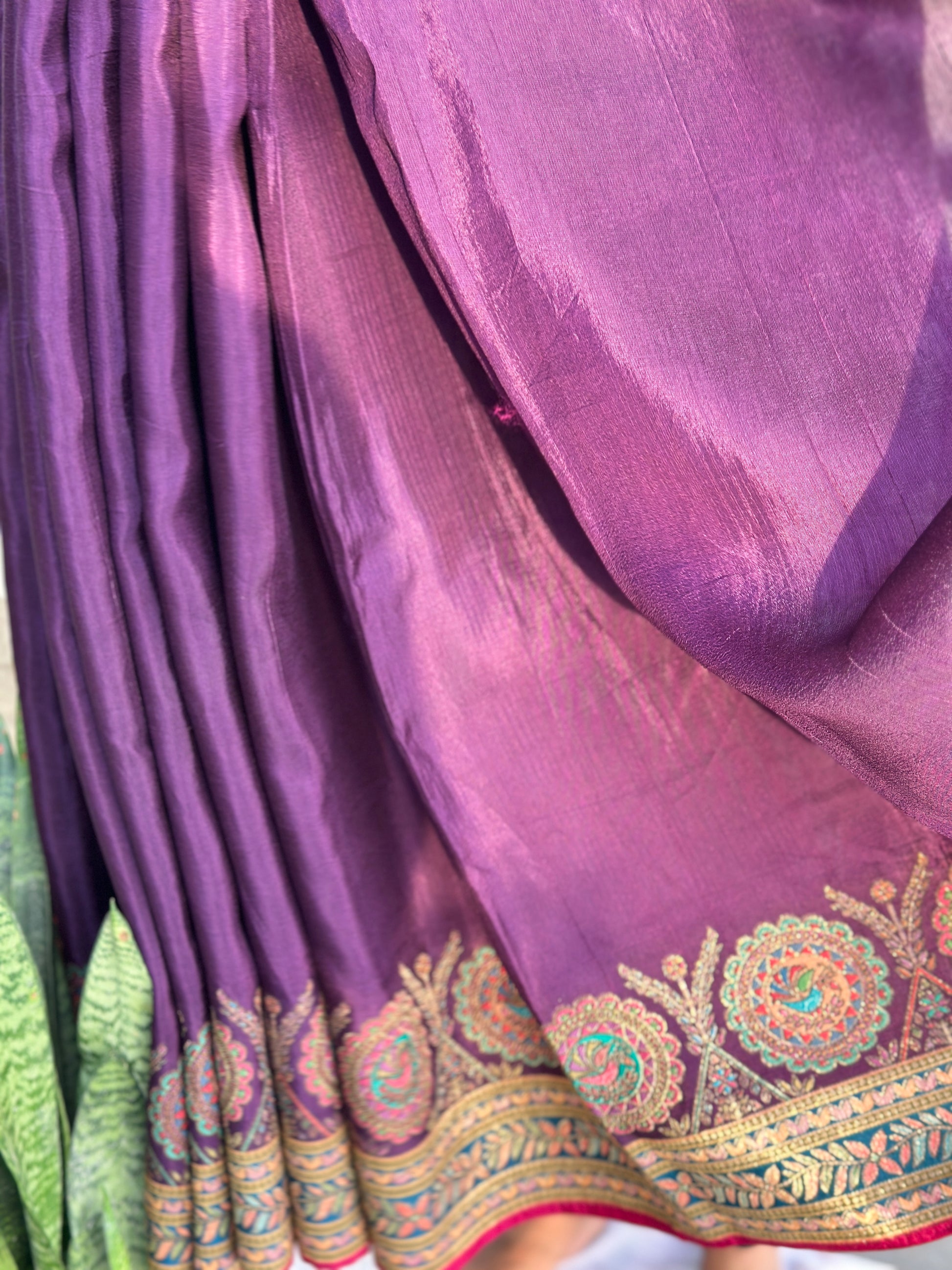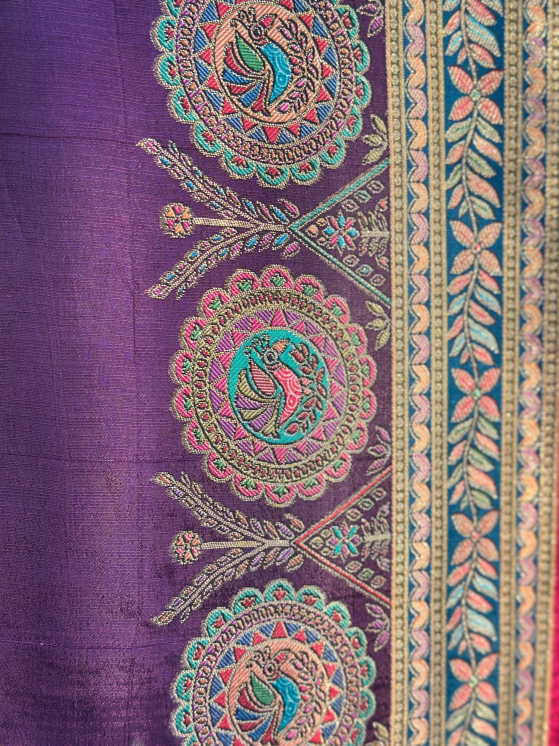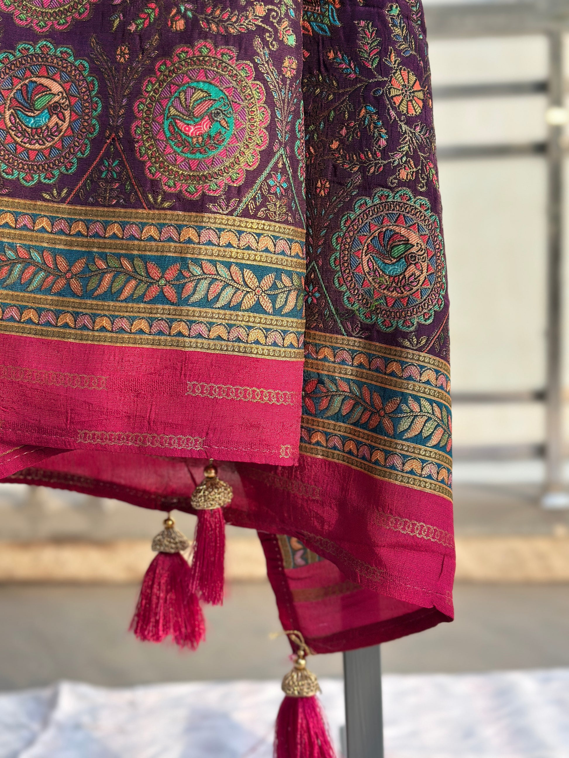 This purple Dola Silk saree showcases exquisite Kashmiri carving motifs that add a royal charm to its luxurious drape. Smooth, soft, and beautifully detailed, it’s ideal for festive evenings and special occasions. A perfect choice for those who love traditional artistry styled with a modern, polished finish.