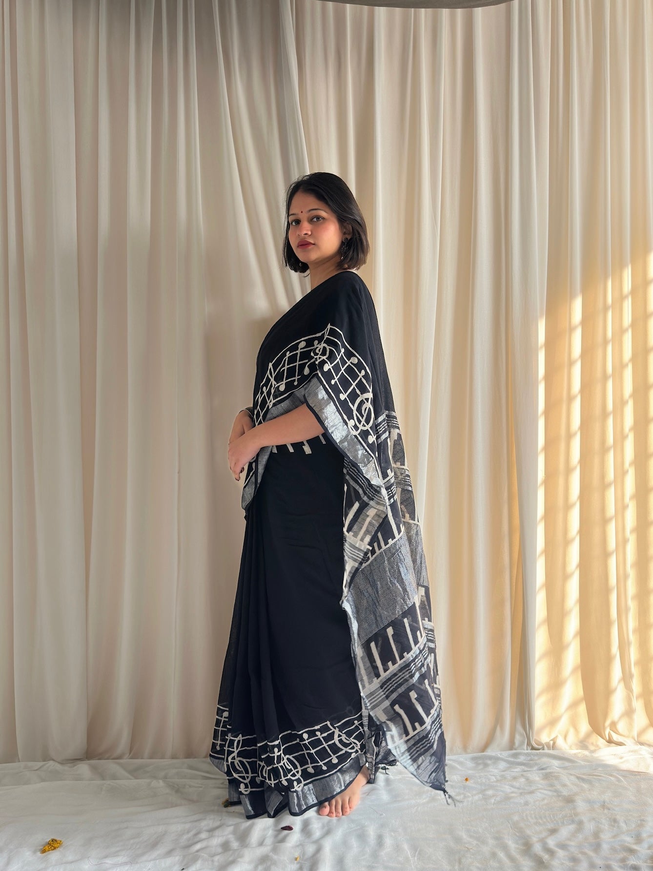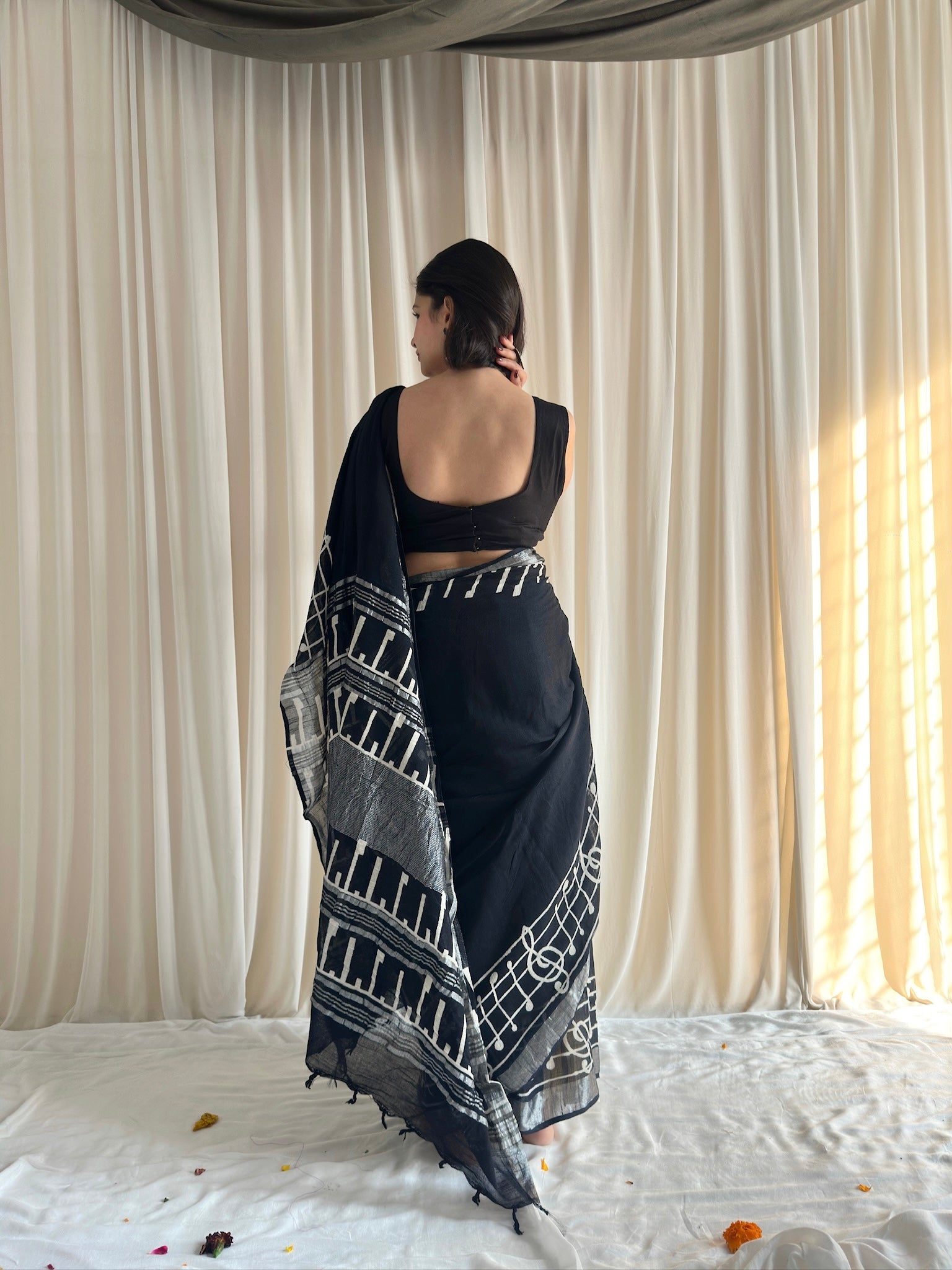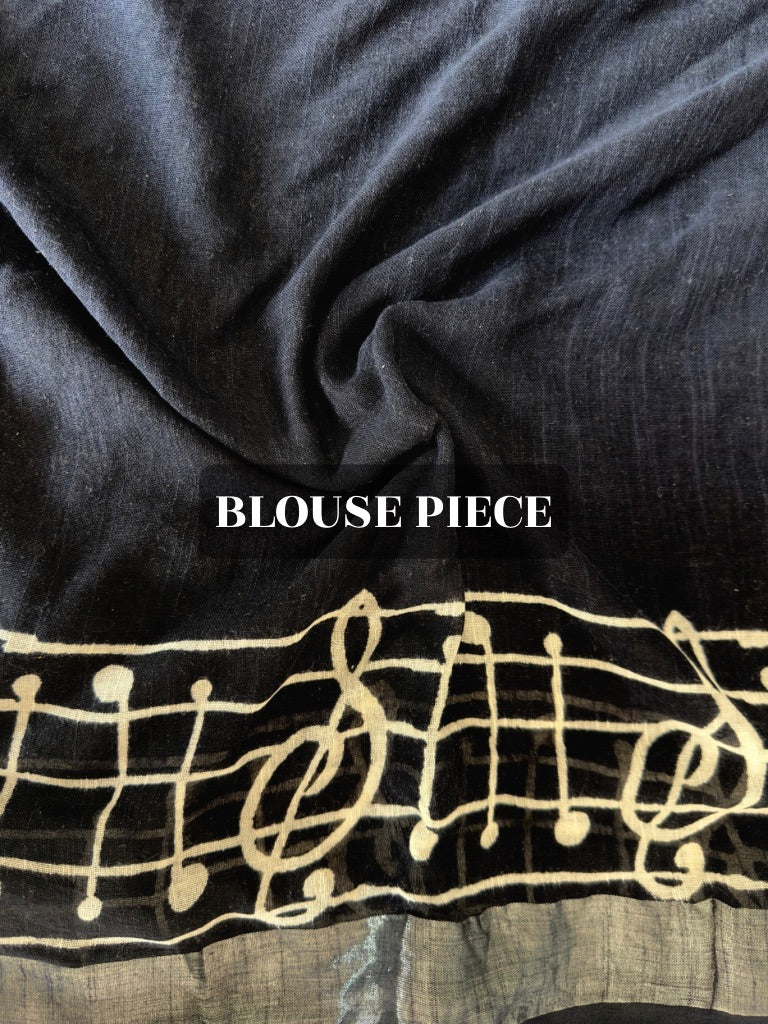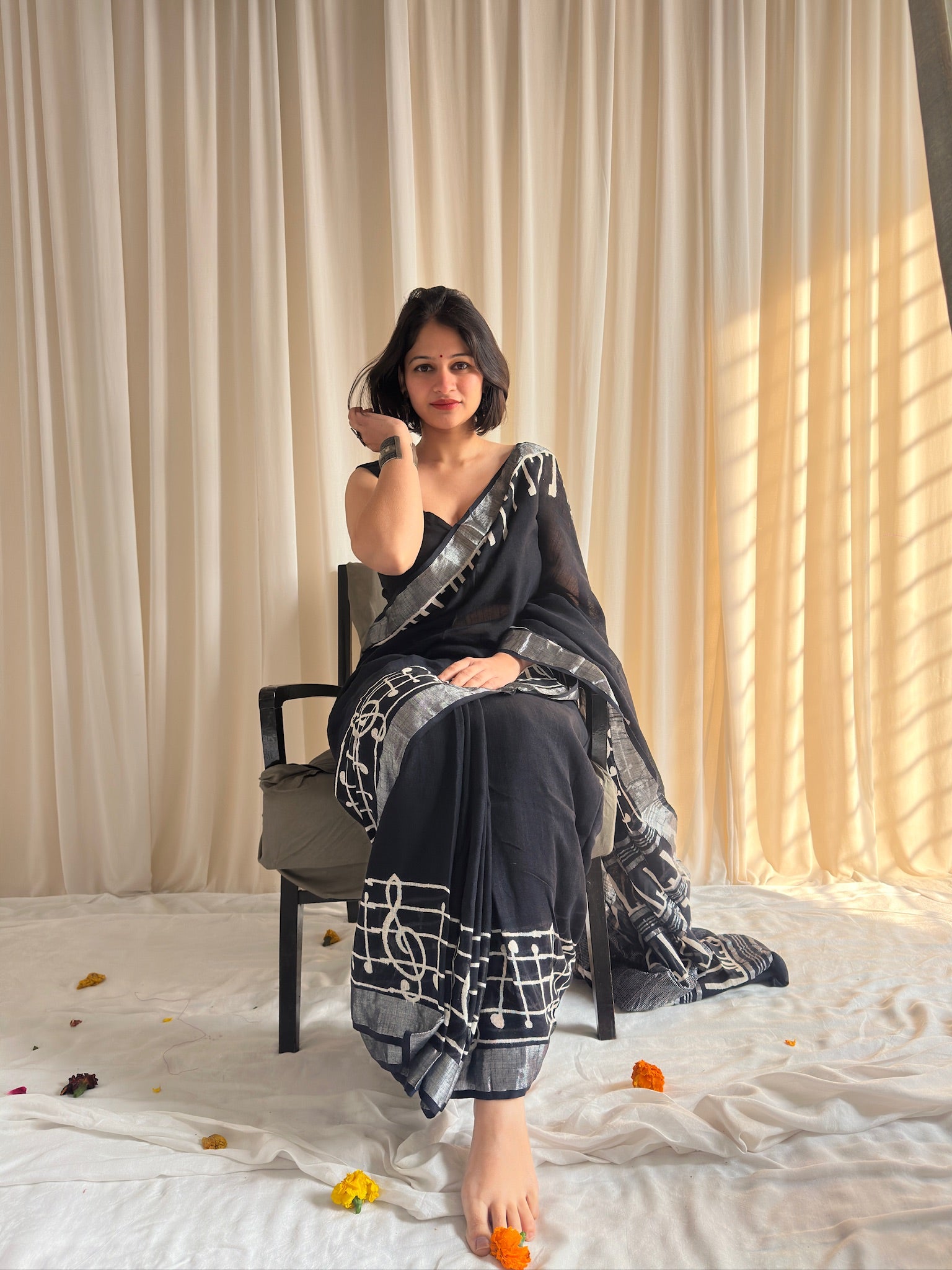 Let your wardrobe sing with this melodious black linen cotton saree that harmonizes comfort with creativity. Musical notes dance playfully across the border and pallu, turning this classic drape into a symphony of style.