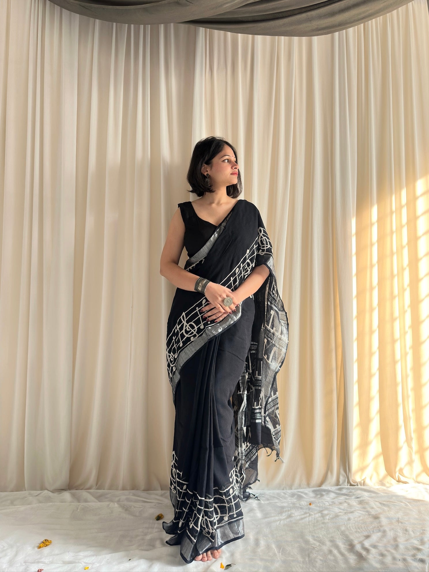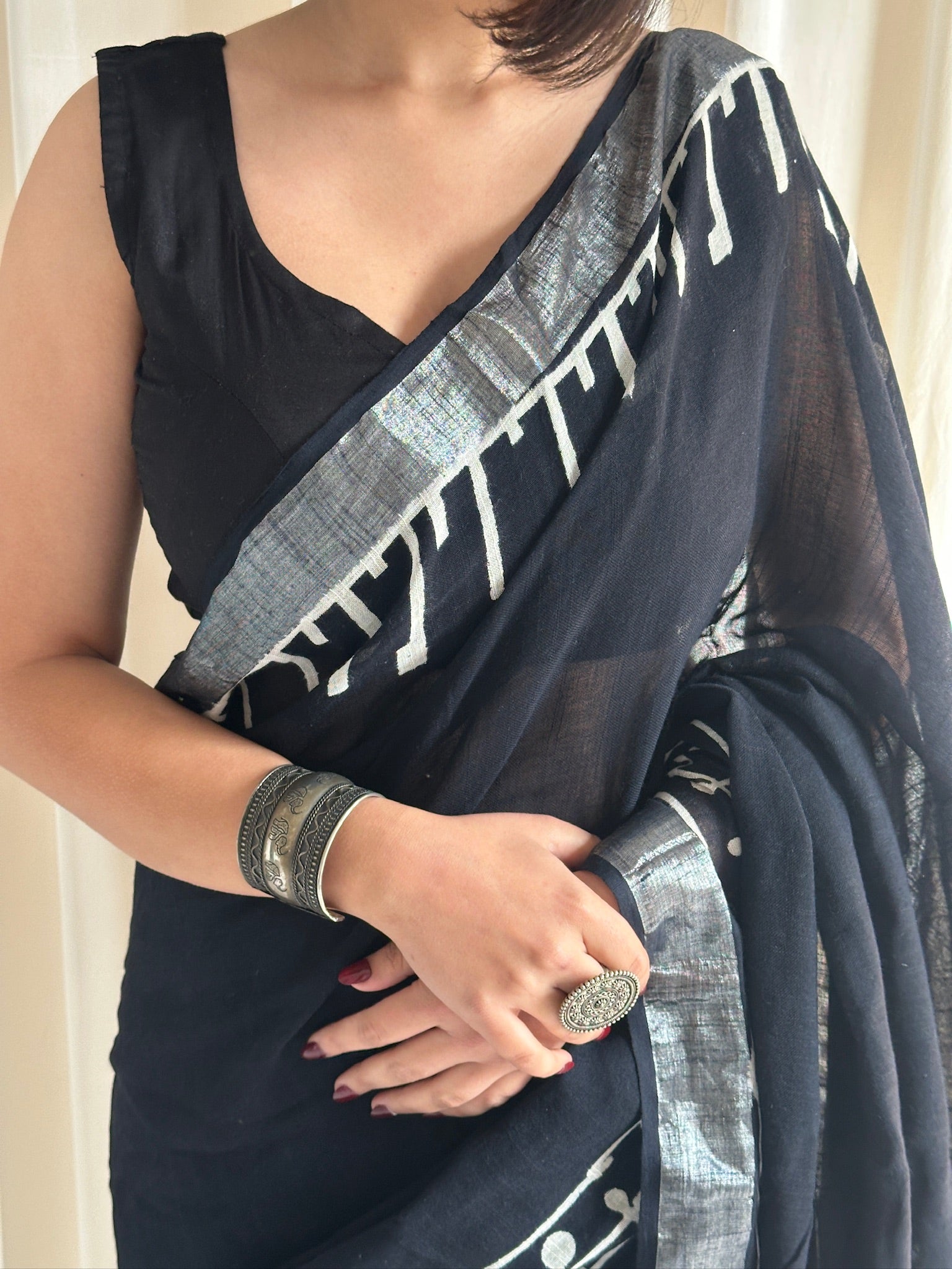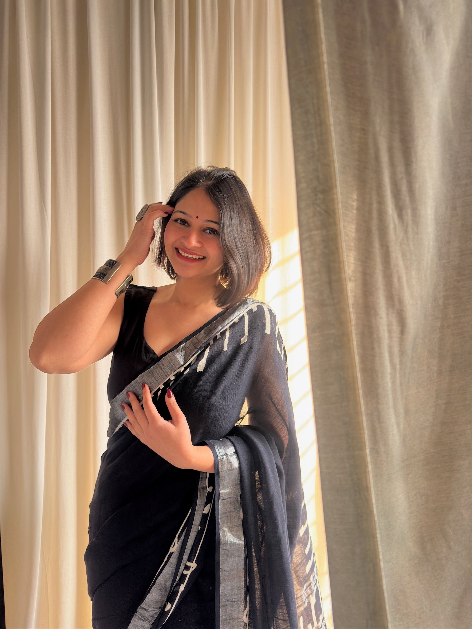 Let your wardrobe sing with this melodious black linen cotton saree that harmonizes comfort with creativity. Musical notes dance playfully across the border and pallu, turning this classic drape into a symphony of style.