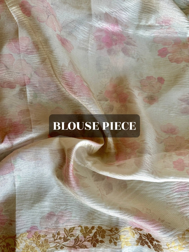 Experience ethereal elegance with Gulbahaar crush organza saree, adorned with delicate floral prints that capture nature's beauty. The lightweight fabric drapes gracefully, offering supreme comfort for all-day wear without compromising on style.