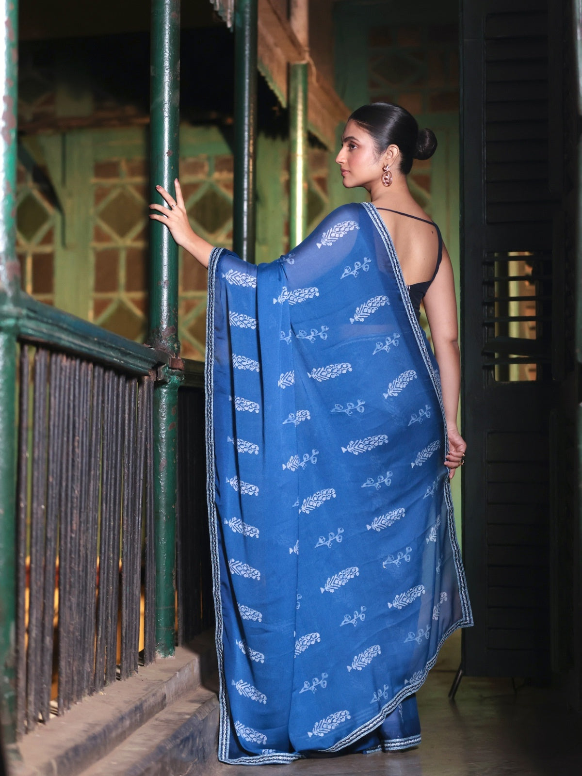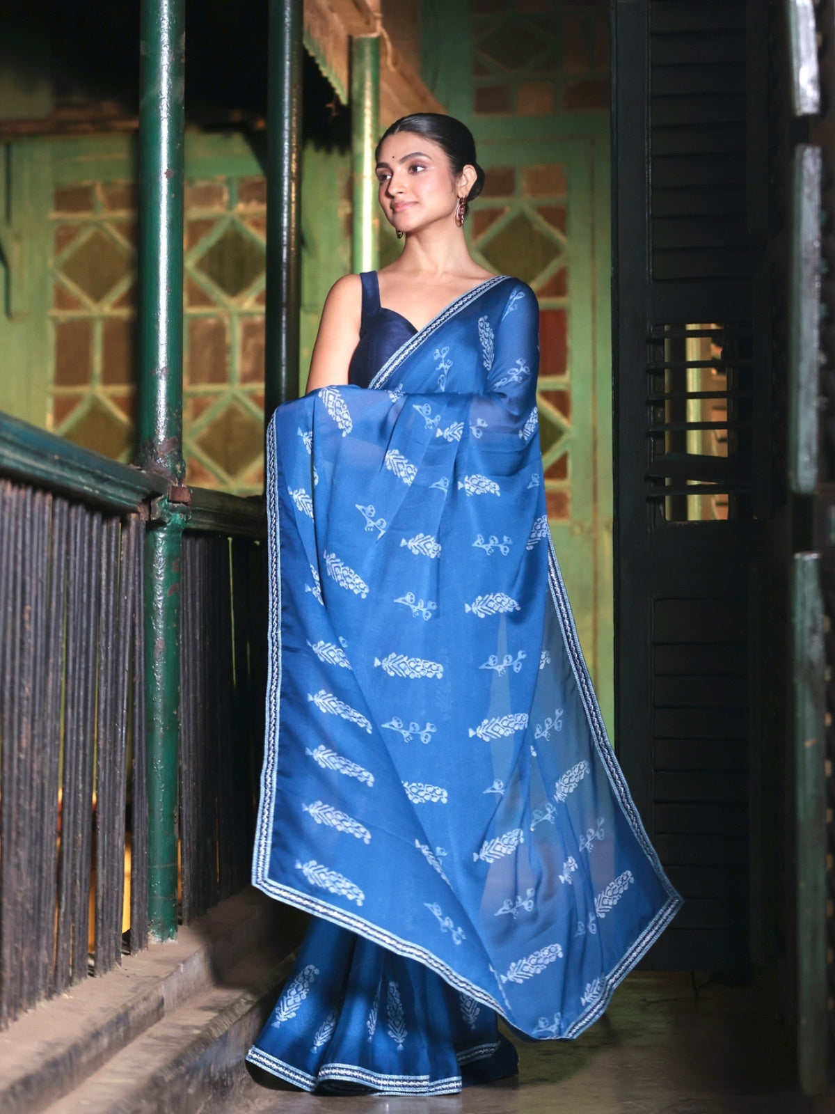 A calm blue canvas brought to life with block print inspired motifs, this moss crepe saree drapes like a dream. The soft, fluid texture paired with artisanal-style prints makes it perfect for days when you want effortless elegance with a hint of tradition. Lightweight, graceful, and endlessly versatile - from workdays to small celebrations.