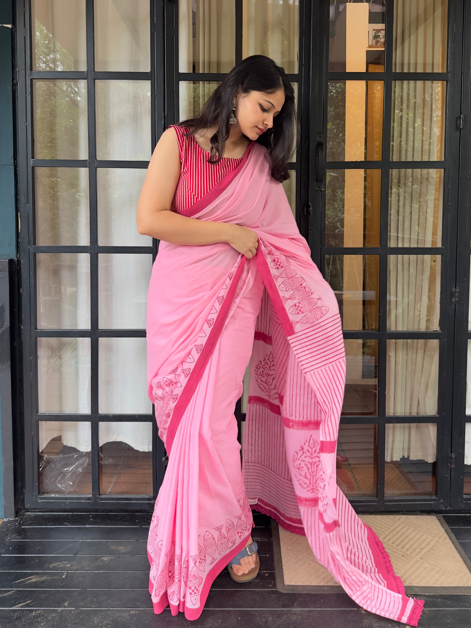 Meet Manchalli - a breezy mul mul cotton saree in shades of pink, adorned with playful fish prints and finished with premium lace detailing. Inspired by the free spirit of a fish, Manchalli captures the essence of effortless charm and movement - just like the ones that swim wild and carefree.