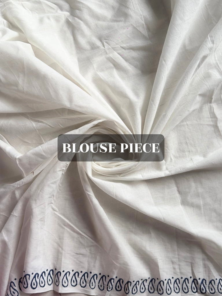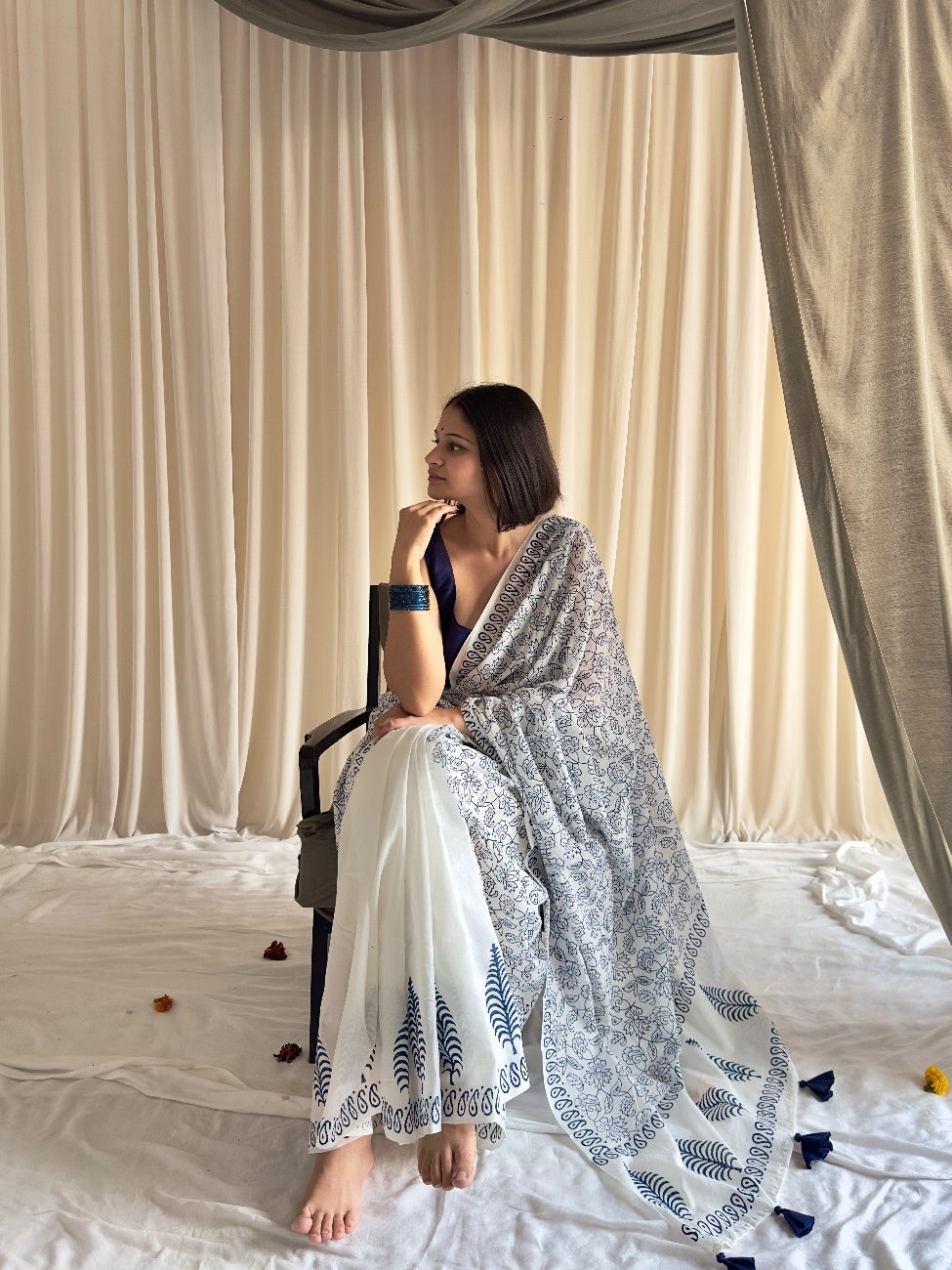Meet Meghna - a crisp white mulmul cotton saree that's as professional as it is pretty! This half-and-half wonder features stunning indigo hand block prints that tell a story with every wear. The artisanal detailing brings character to your work wardrobe, transforming ordinary office days into opportunities to showcase your refined taste.