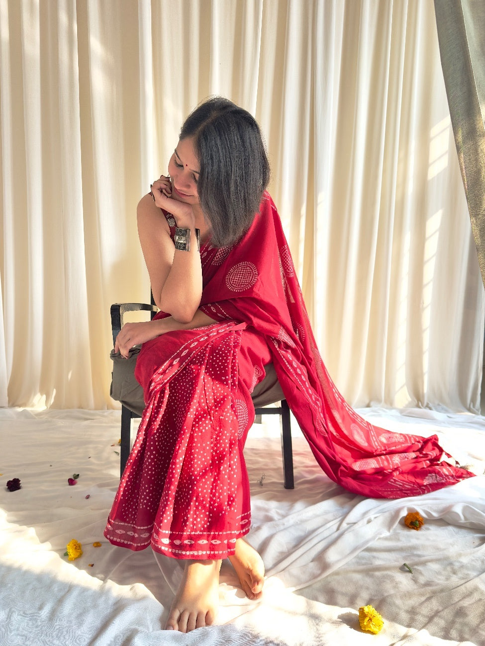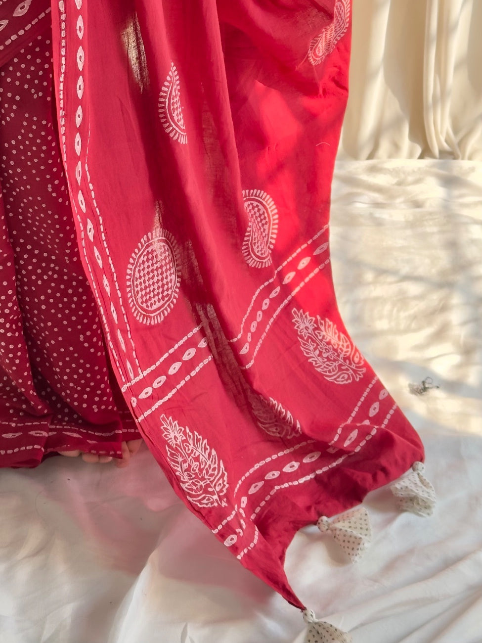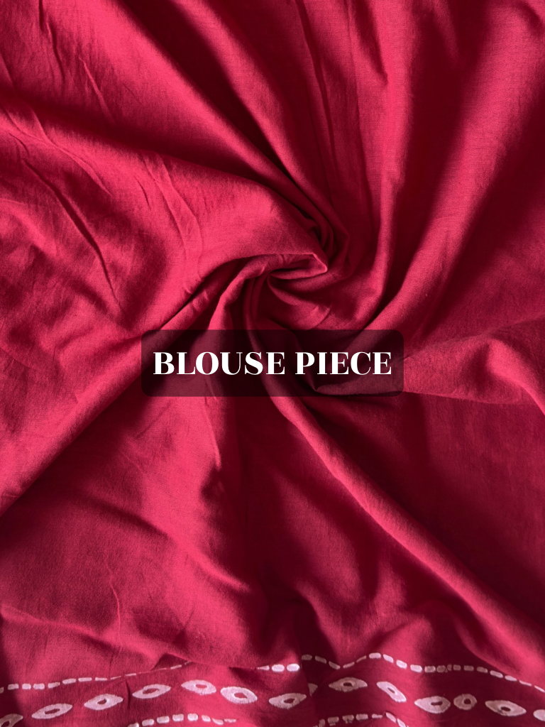 Your go-to red half & half saree that's equal parts bold and beautiful! This charming piece features traditional block printing that tells a story with every motif. The clever half & half design gives you the best of both worlds: one side showcases intricate printed patterns while the other offers a clean, versatile canvas.