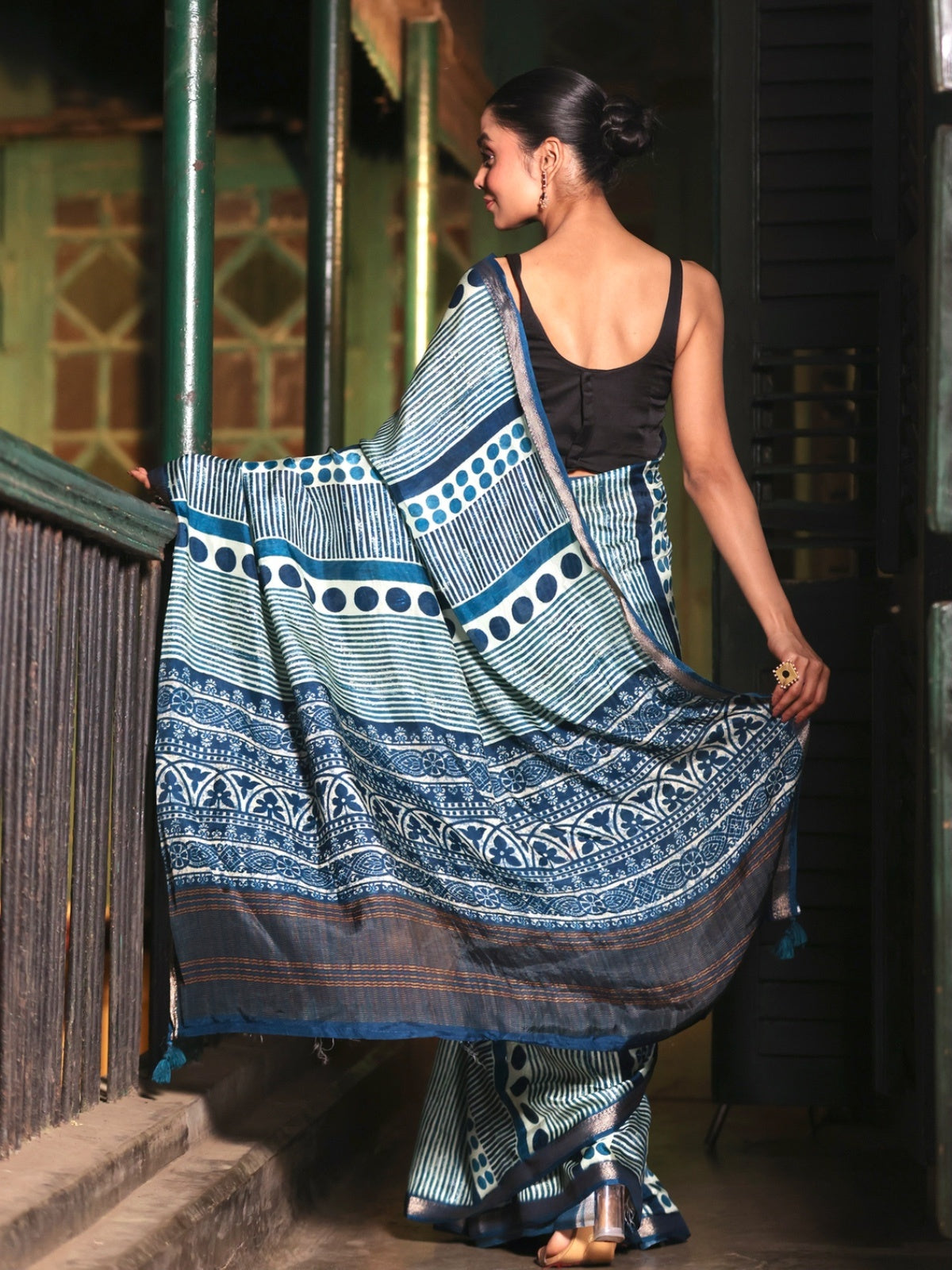 A little stripes, a little dots, and a whole lot of charm. This indigo-blue ajrakh printed saree blends modern geometry with traditional block print aesthetics, finished with a subtle zari border for that extra glow. Made in soft, breathable fabric that drapes like a dream - from desk hours to dinner plans.