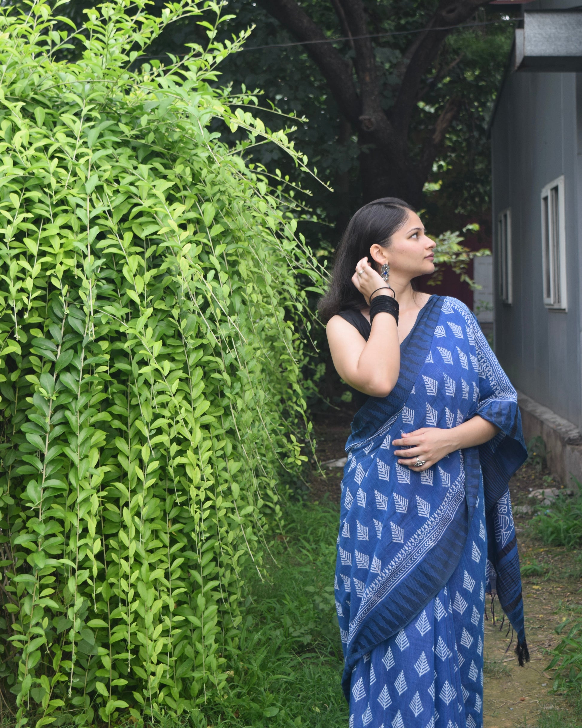 A saree that feels like a soft summer breeze - this blue katan cotton & linen saree is hand block printed with love and care. The temple border adds a hint of nostalgia, inspired by age-old craftsmanship from Indian looms. Whether it's a haldi ceremony or a quiet brunch, this saree is a graceful companion.