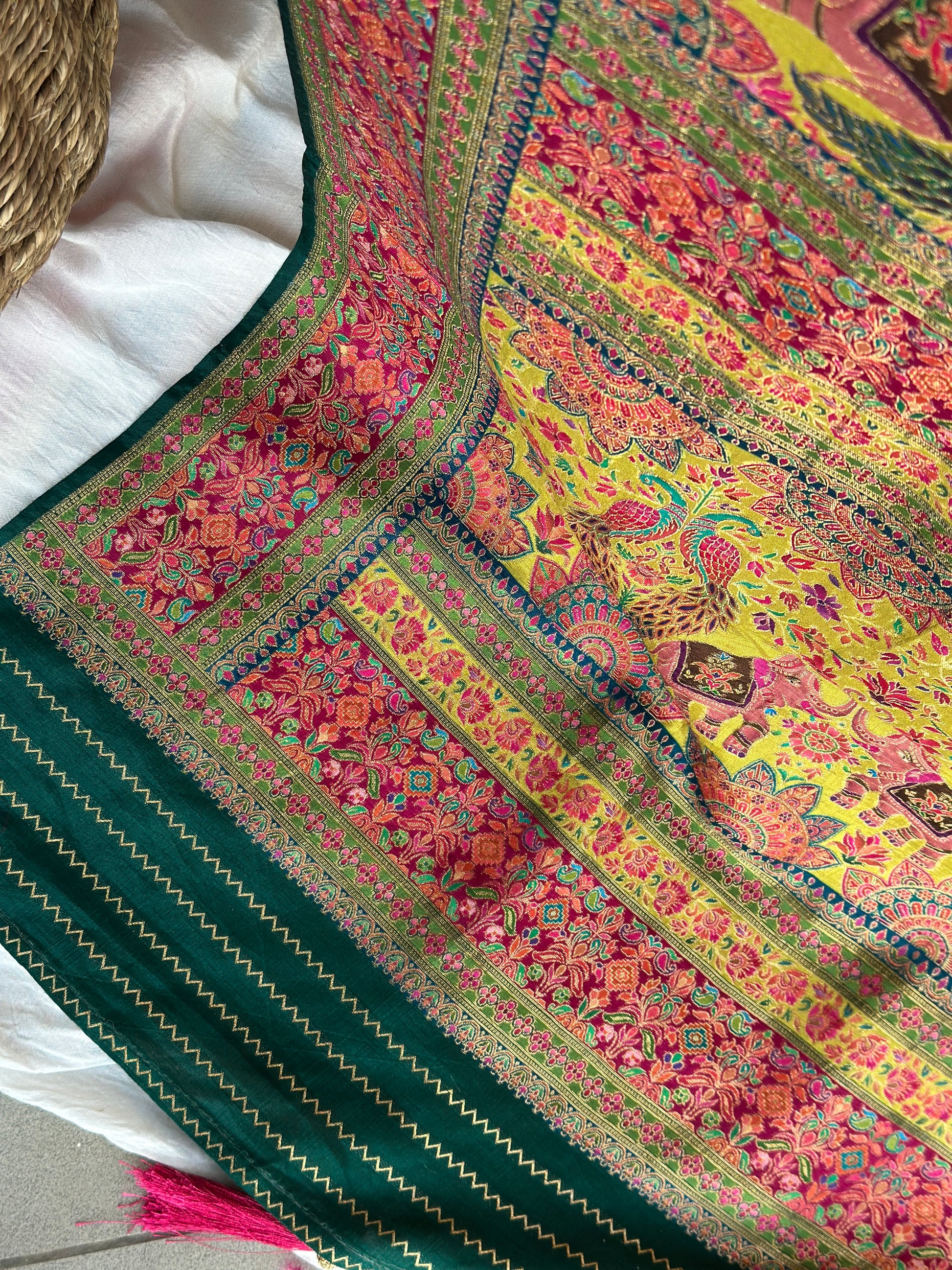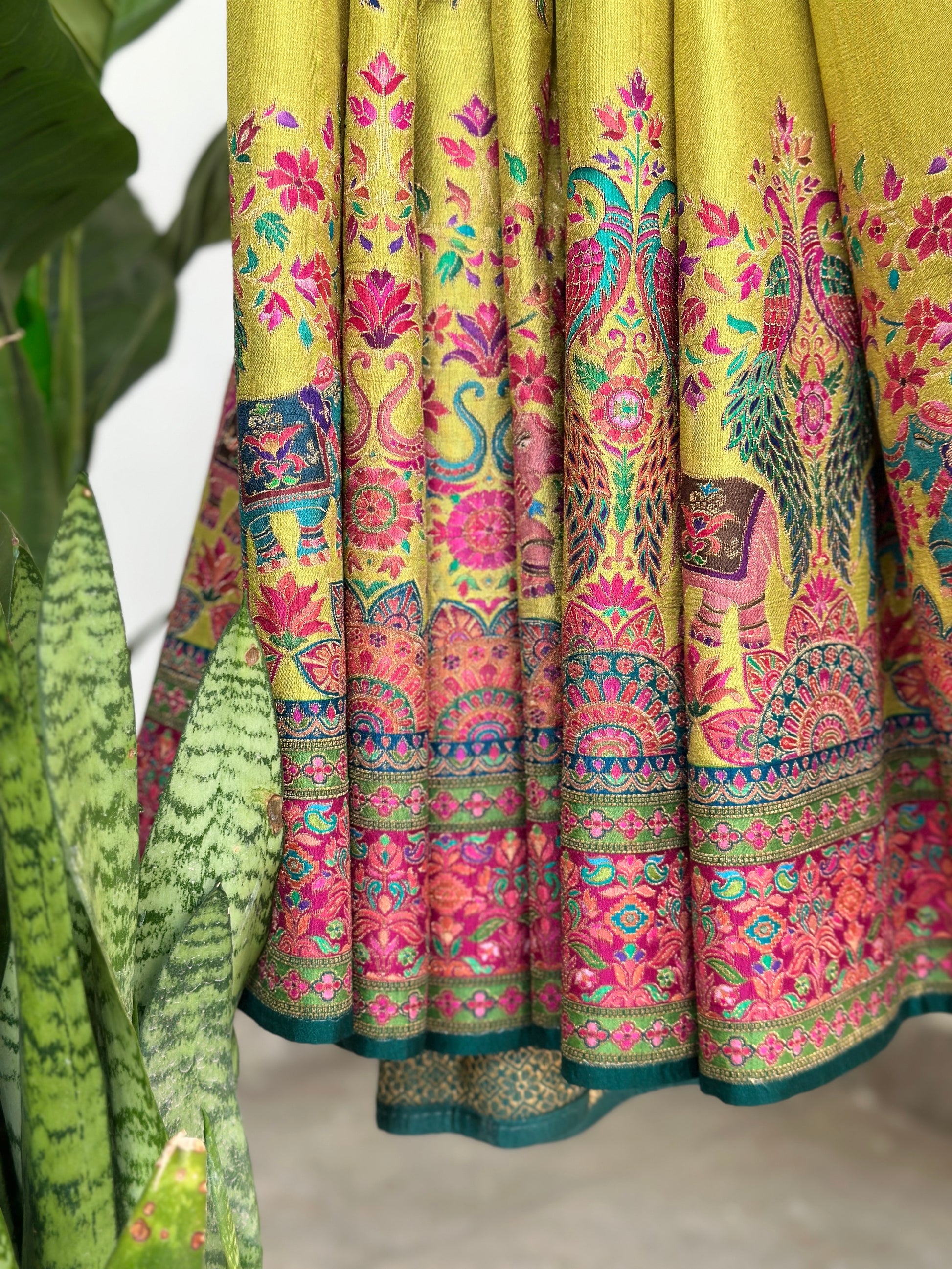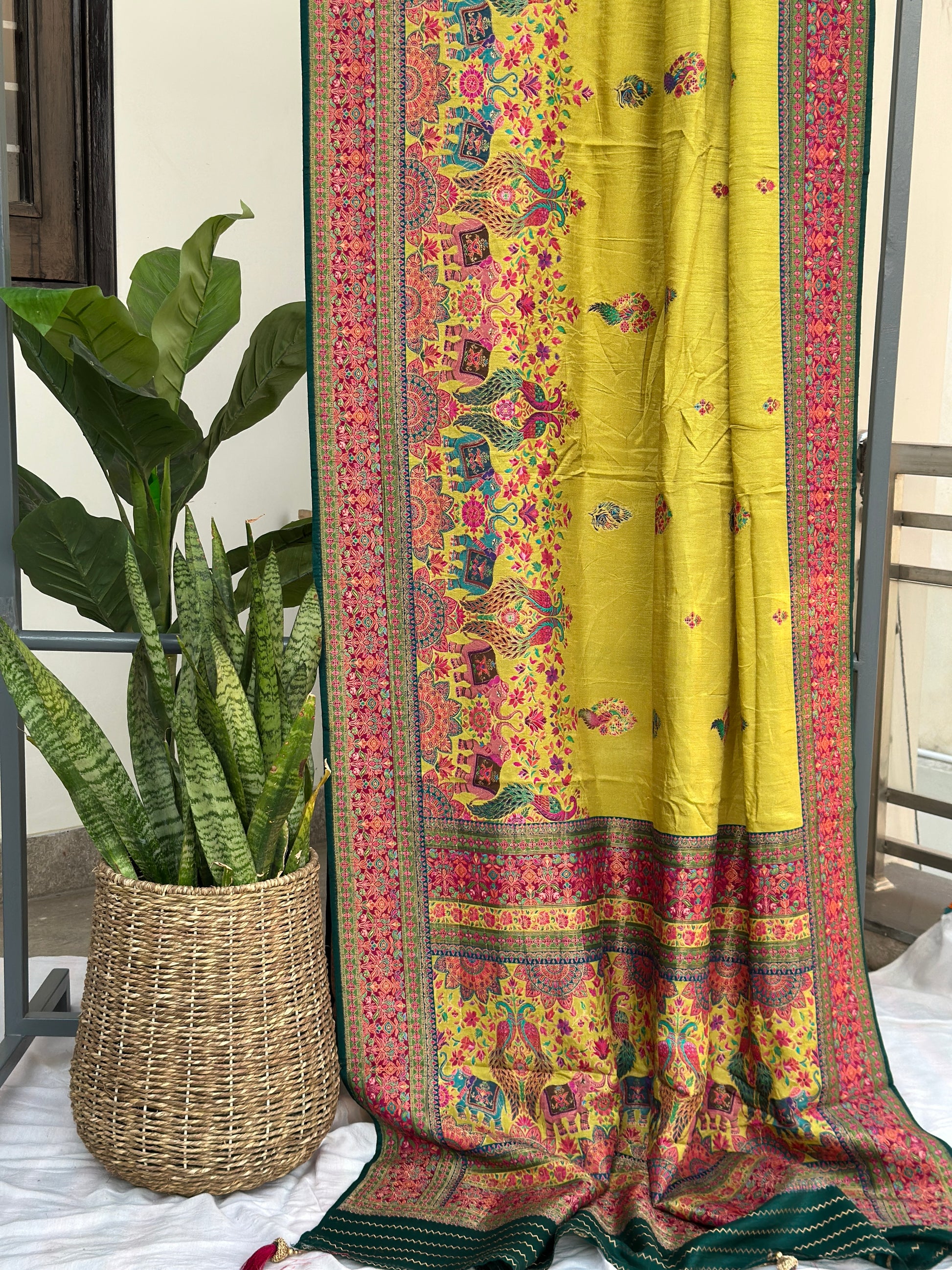 Inspired by Kashmiri artistry, this lime green Dola Silk saree stands out with refined carving motifs and a graceful drape. Lightweight yet opulent, it’s designed for wedding guests, festive events, and timeless styling. Its rich colour and premium woven detailing create the perfect balance of culture and contemporary elegance.