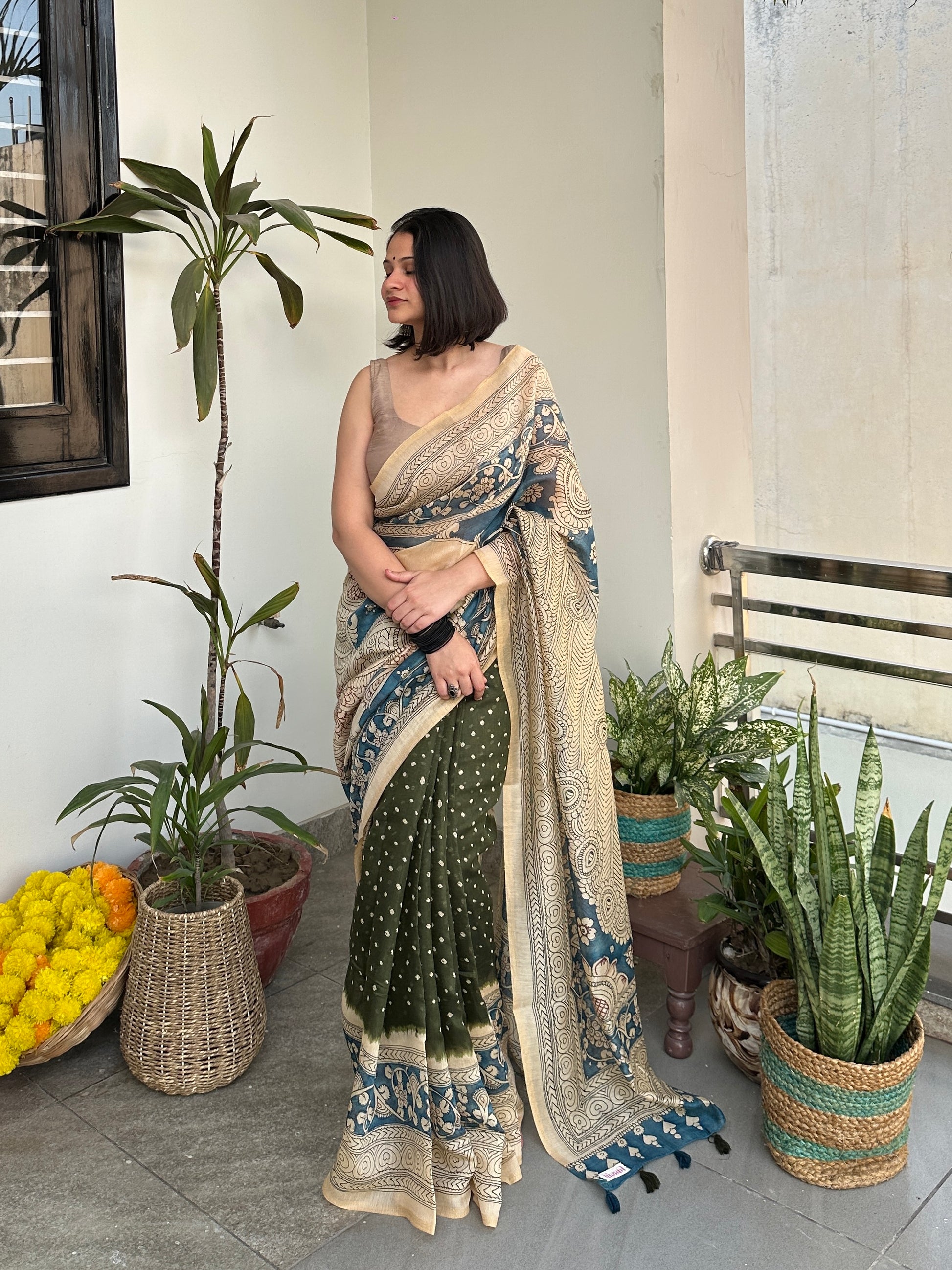 Embrace timeless elegance with the Prakriti Saree – a masterpiece of deep-green handloom fabric adorned with intricate kalmakari art on half body. This sustainable drape exudes earthy sophistication, making it perfect for cultural events, festivities, and heritage fashion lovers.
