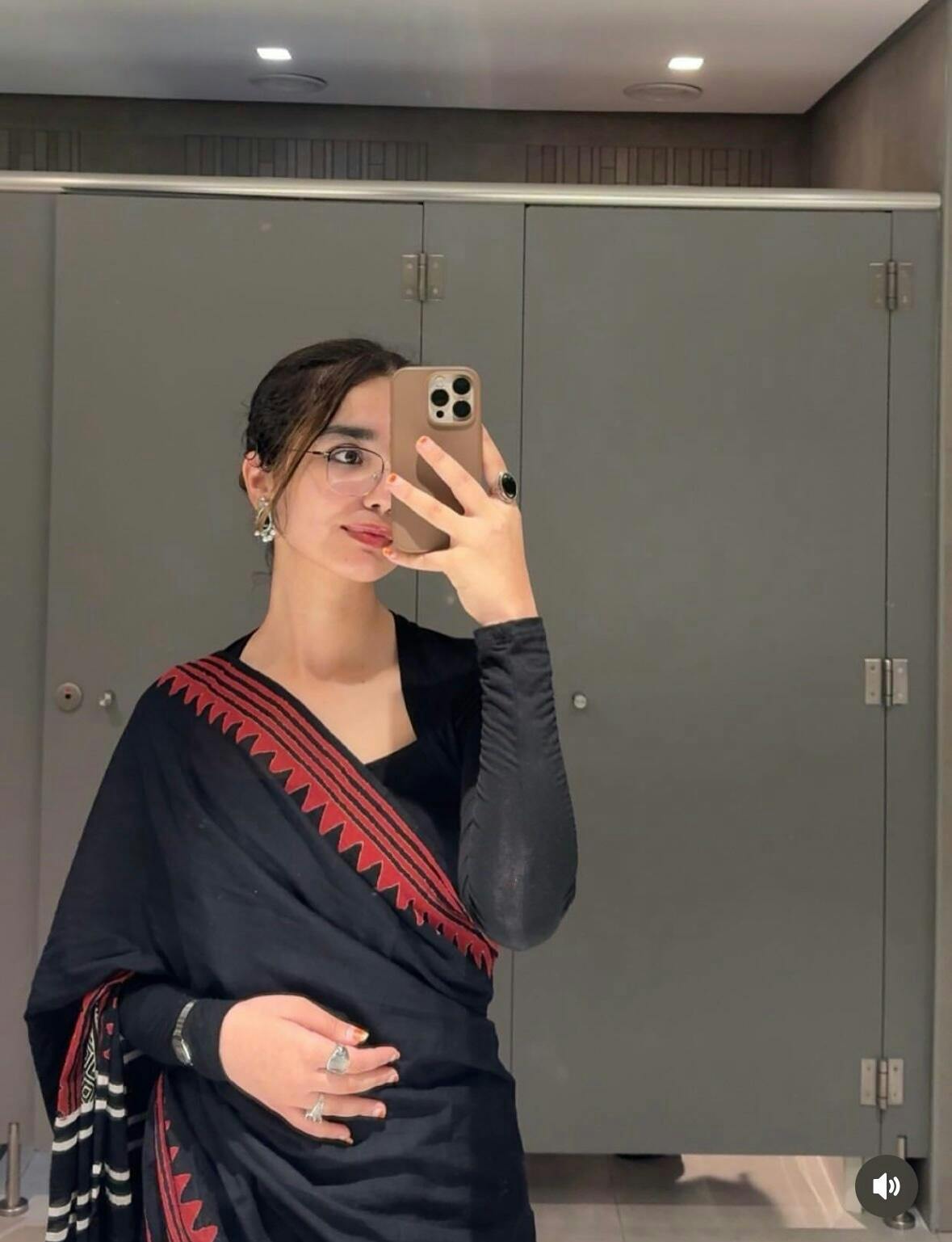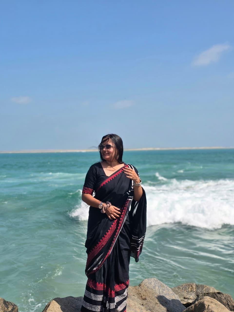 This black hand block printed cotton saree is your go-to for office hours, formal days, and campus strolls — all with effortless grace.