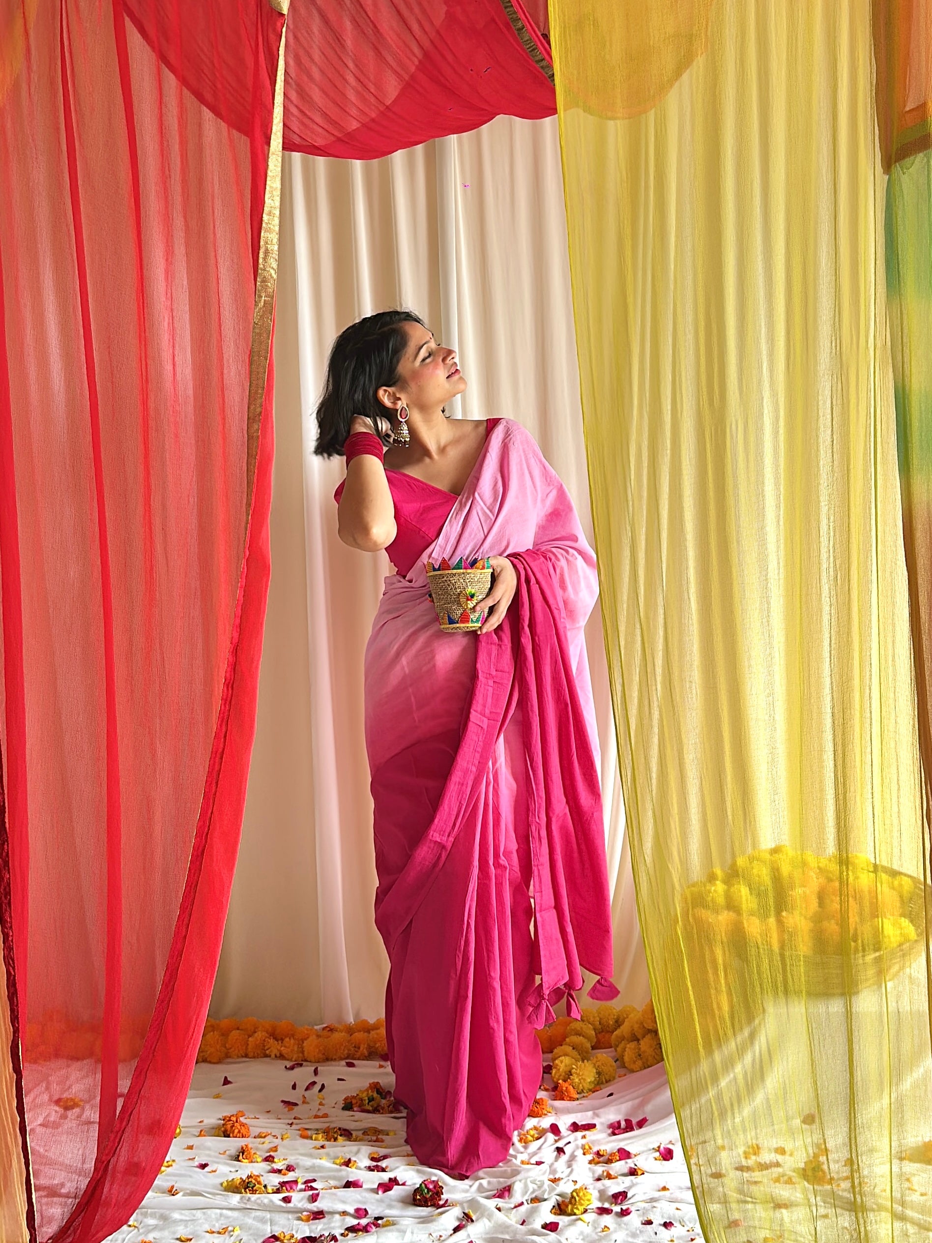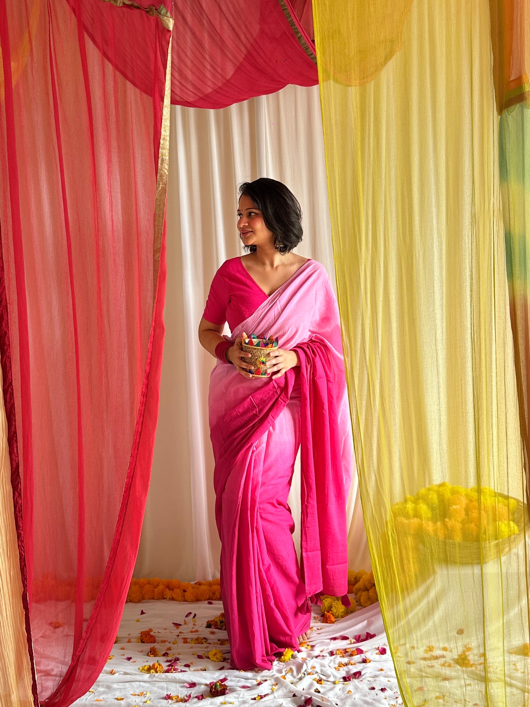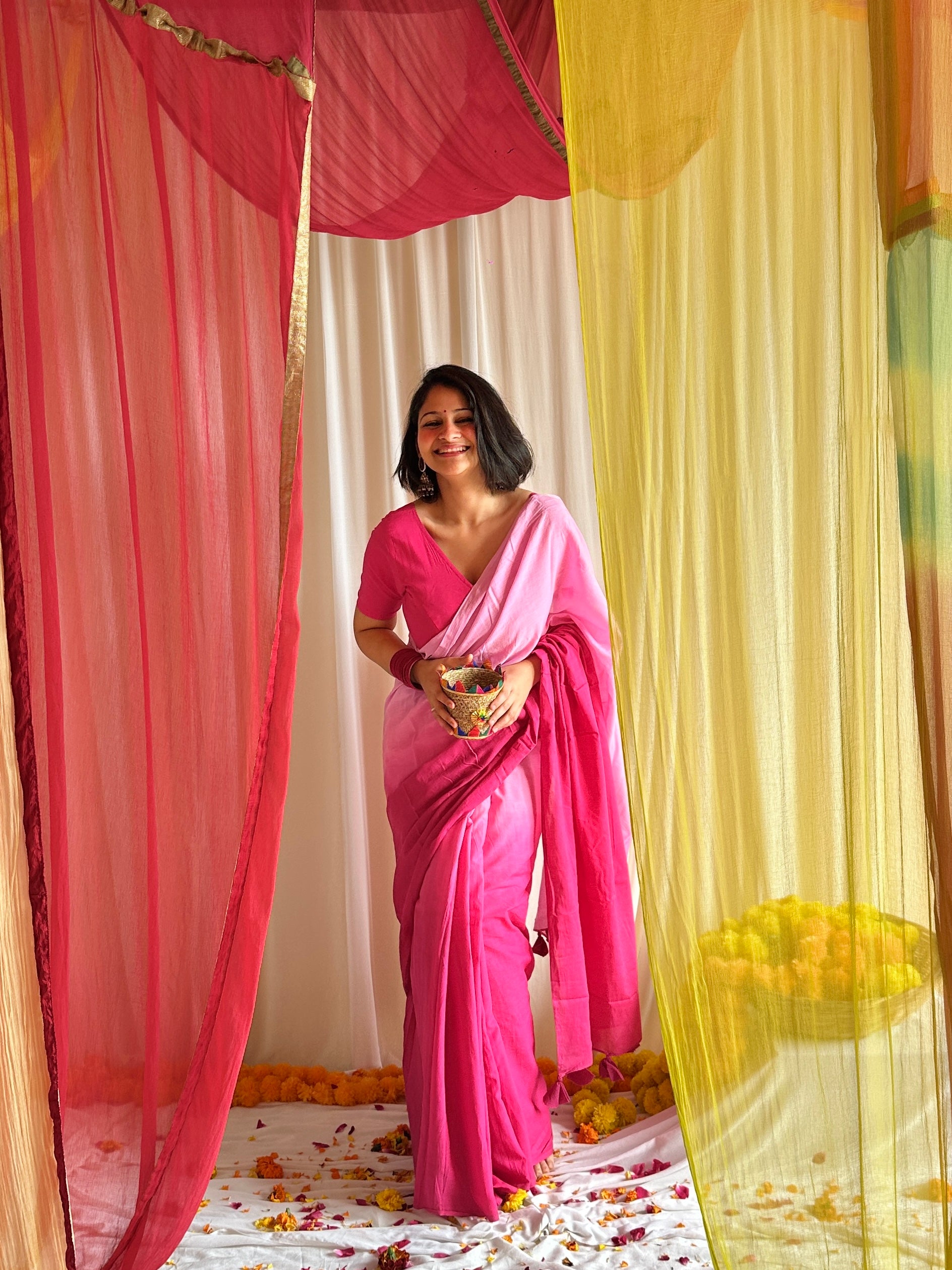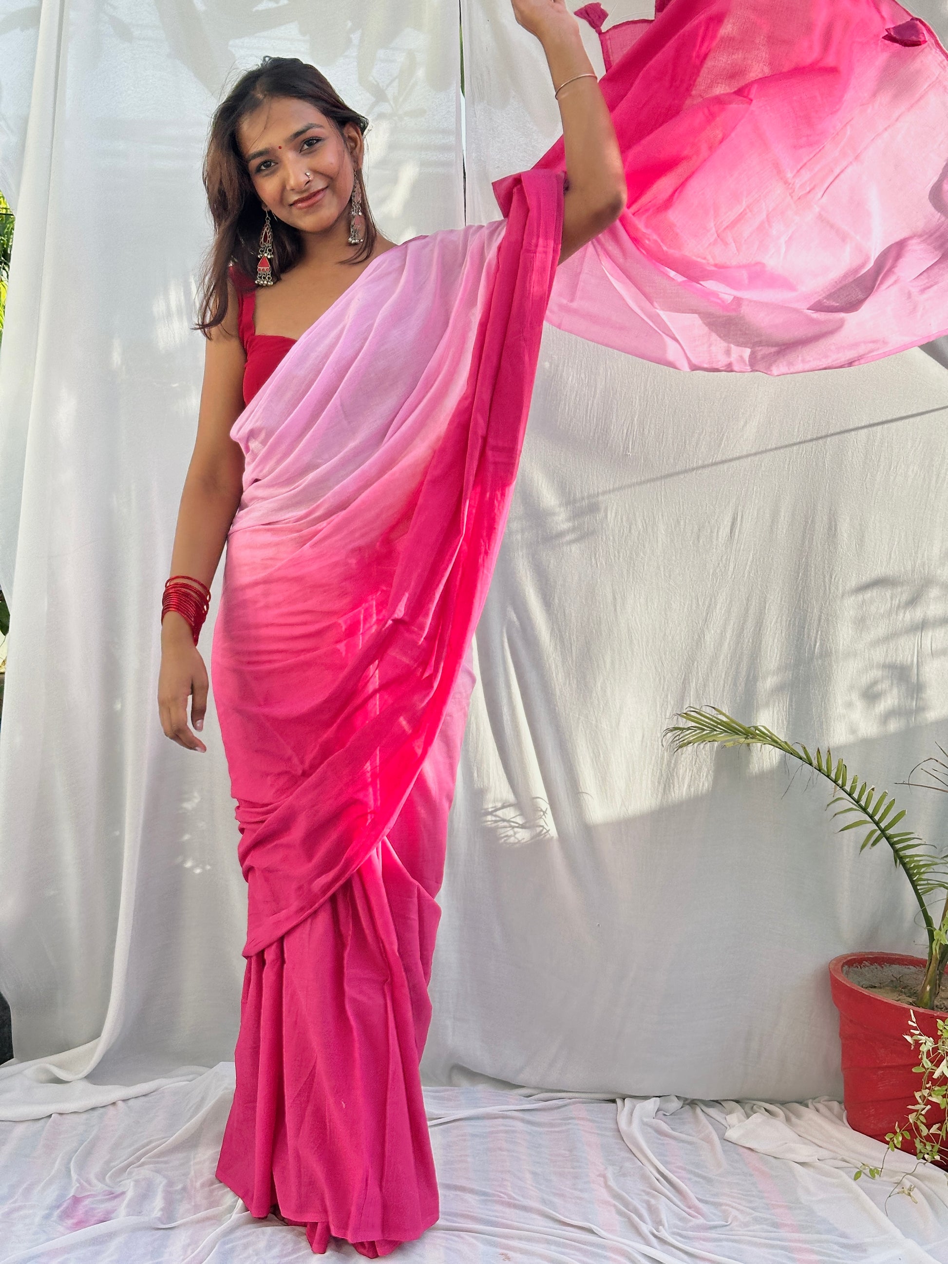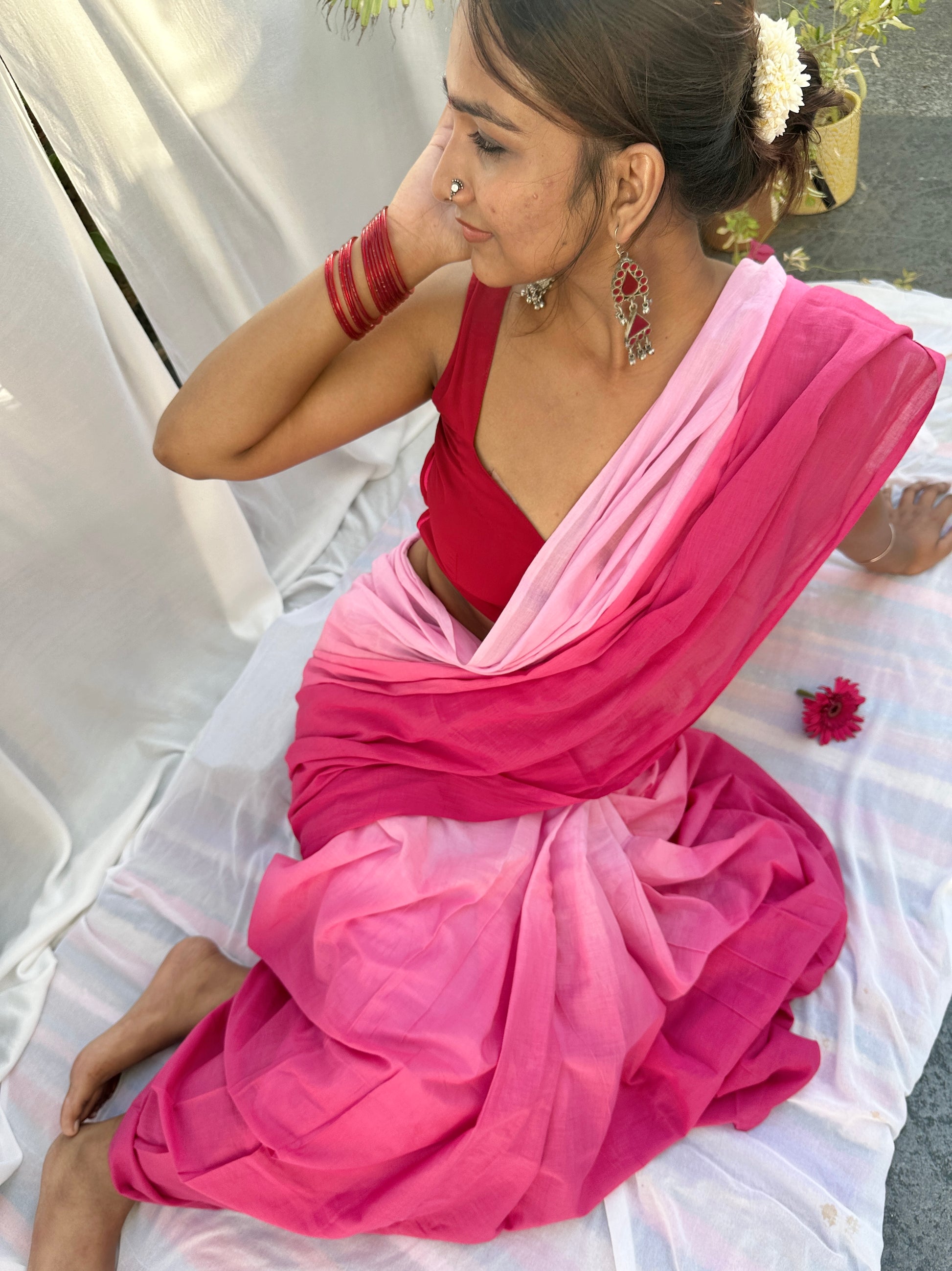 Think pink, but make it magic! This ombre mul cotton saree flows from deep, bold pinks to soft pastel blush tones, giving you the best of both worlds - drama and delicacy.