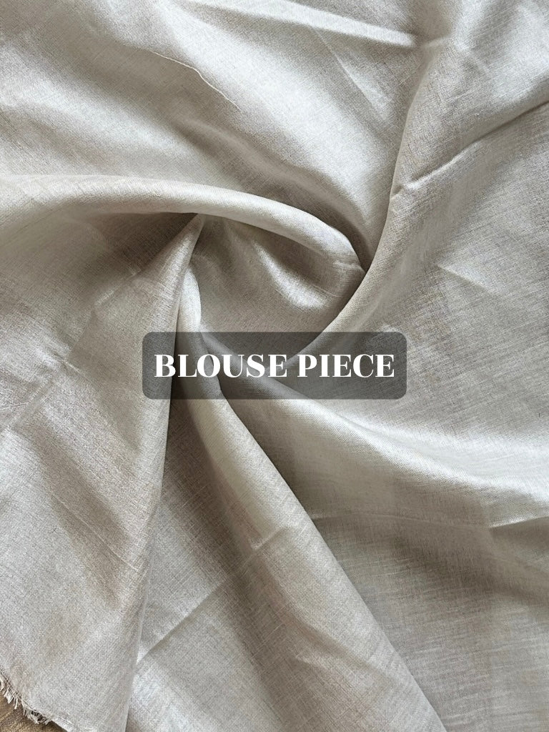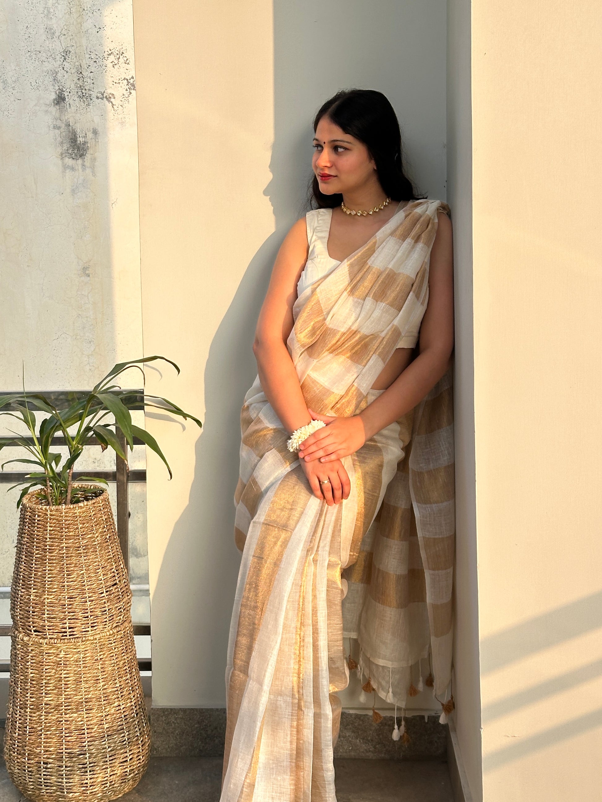 There’s something effortlessly graceful about this ivory and gold linen saree.