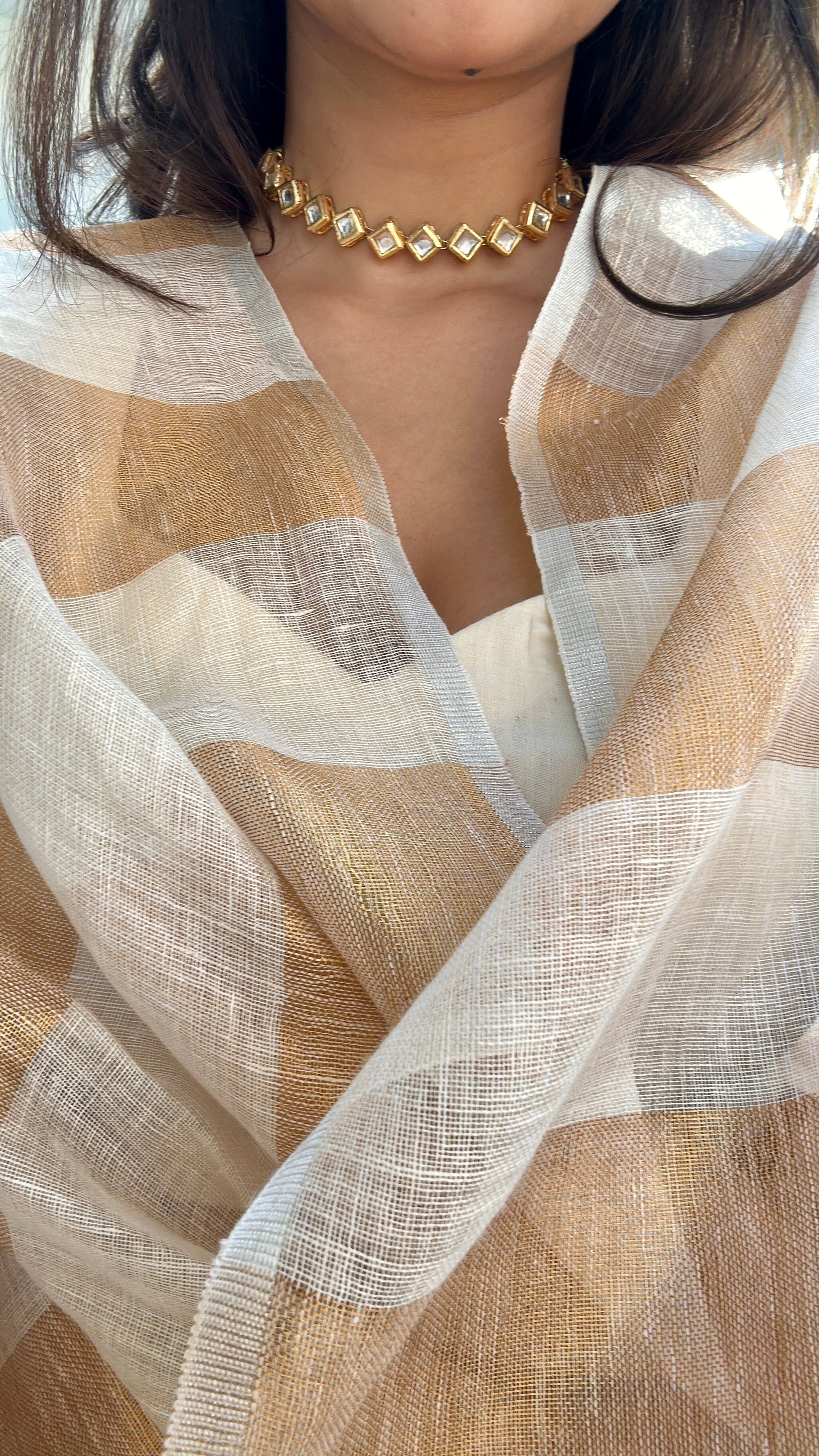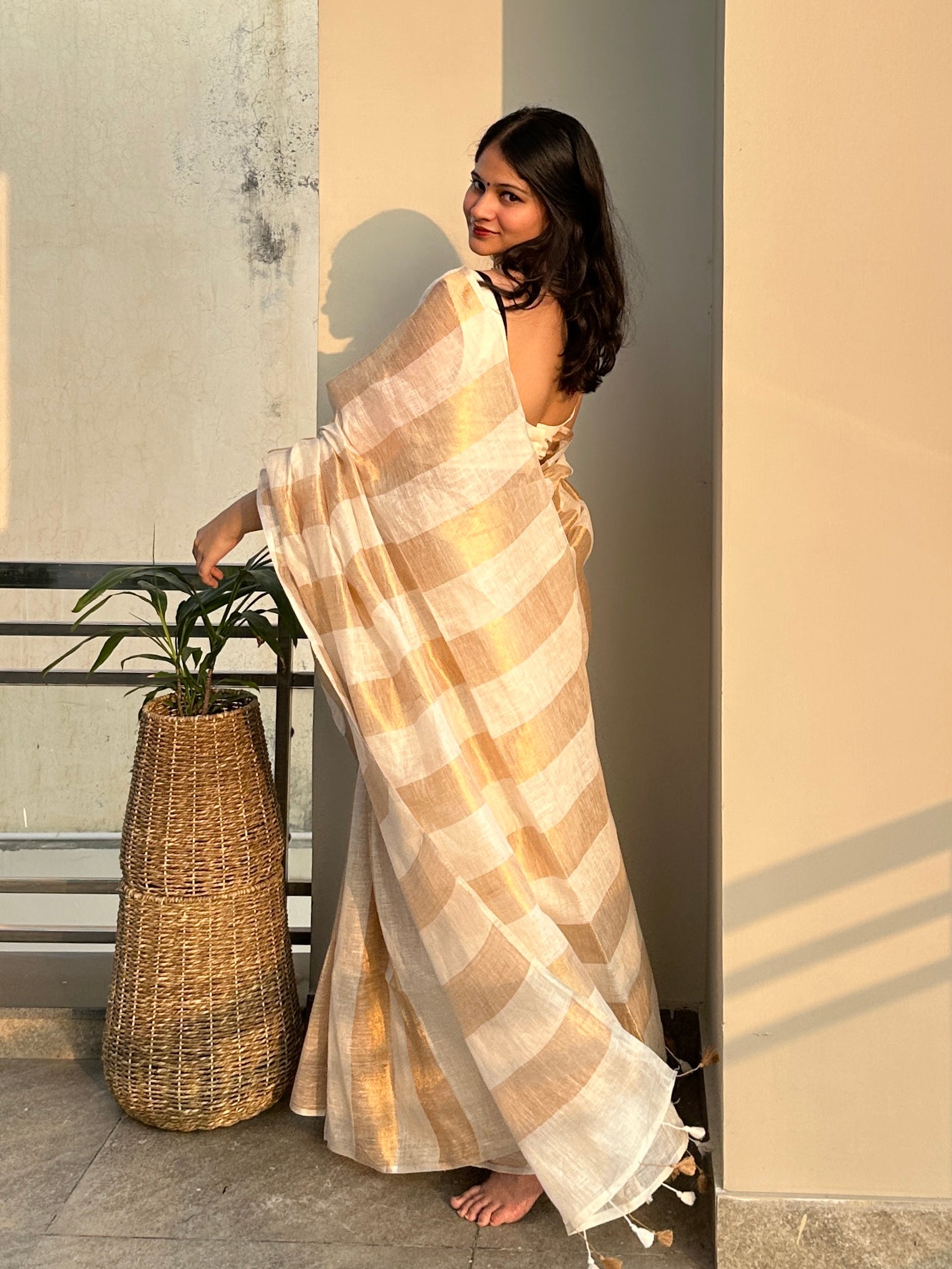 Woven with soft, breathable linen and a touch of shimmer, it captures the beauty of minimalism in every fold. The subtle gold stripes lend it a soft charm without taking away from its understated elegance.