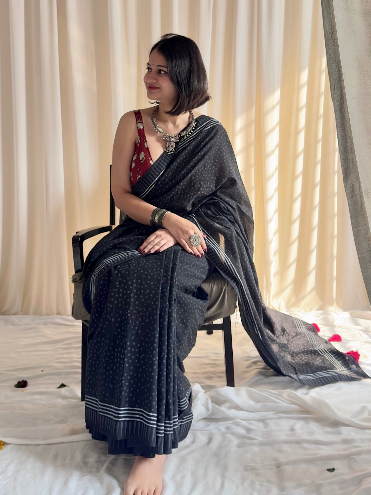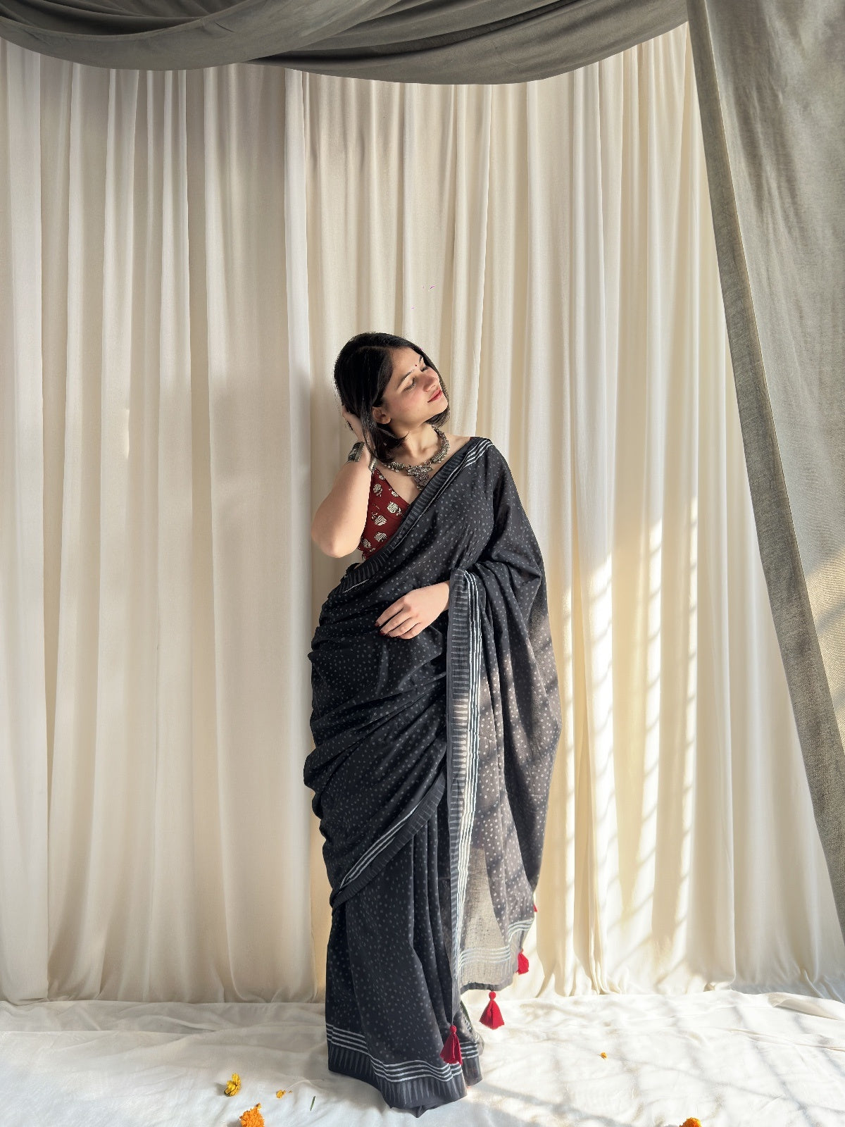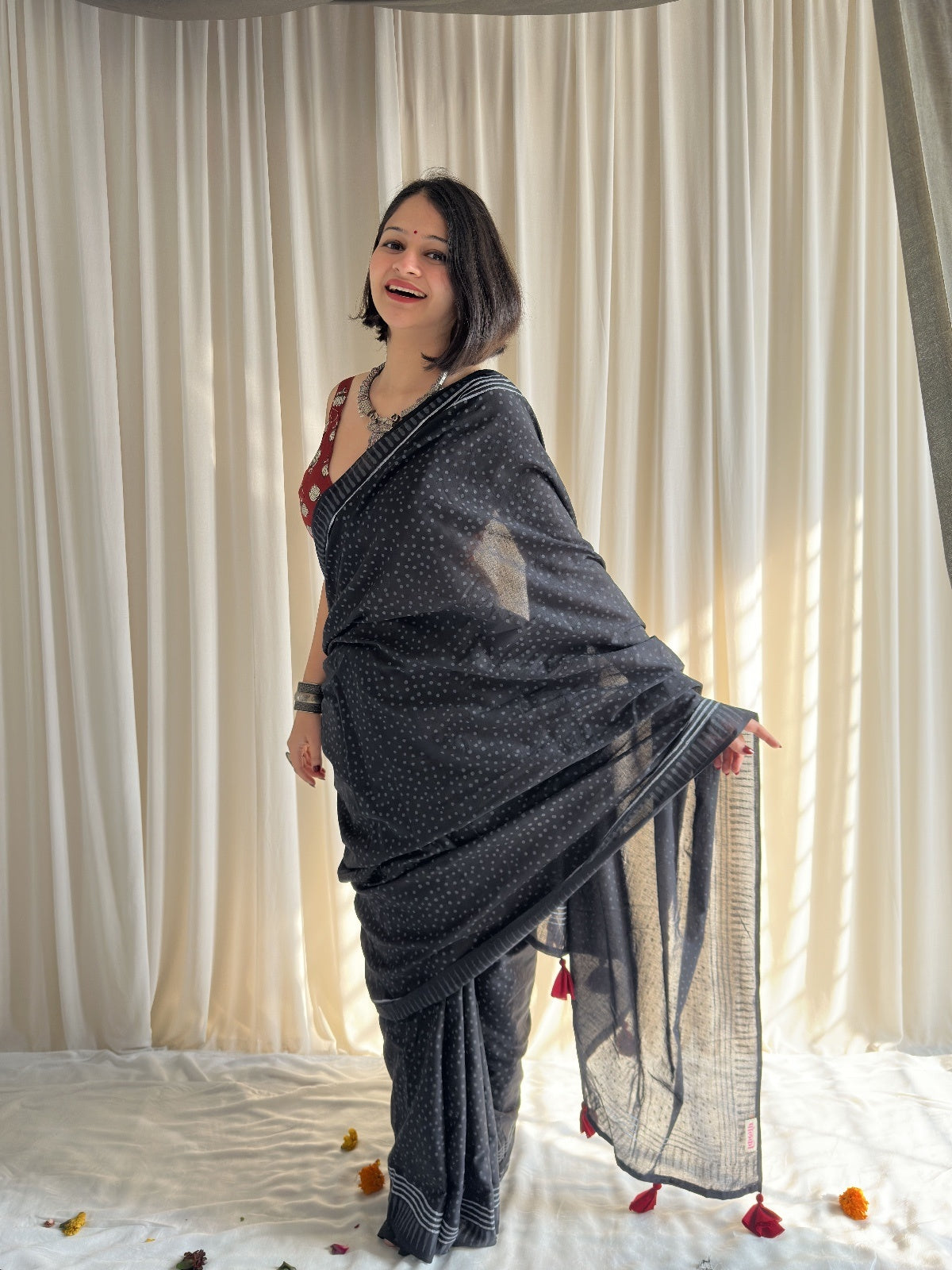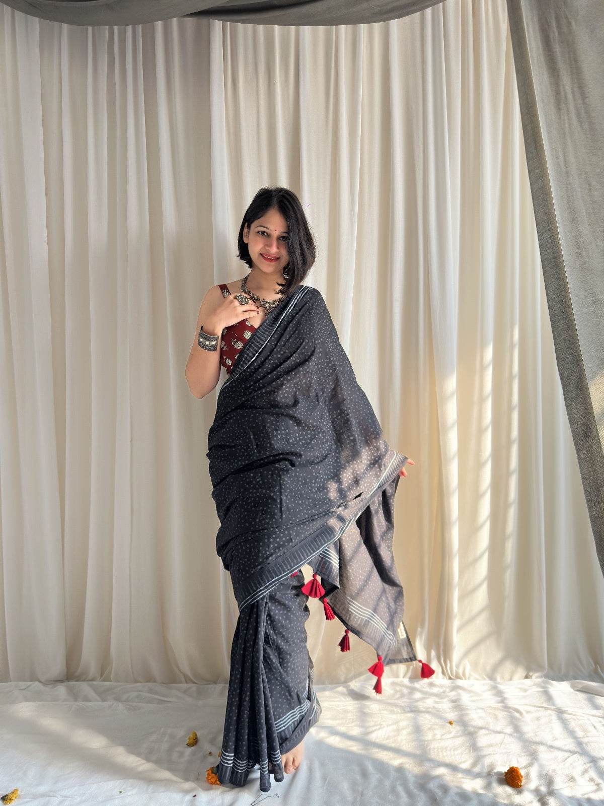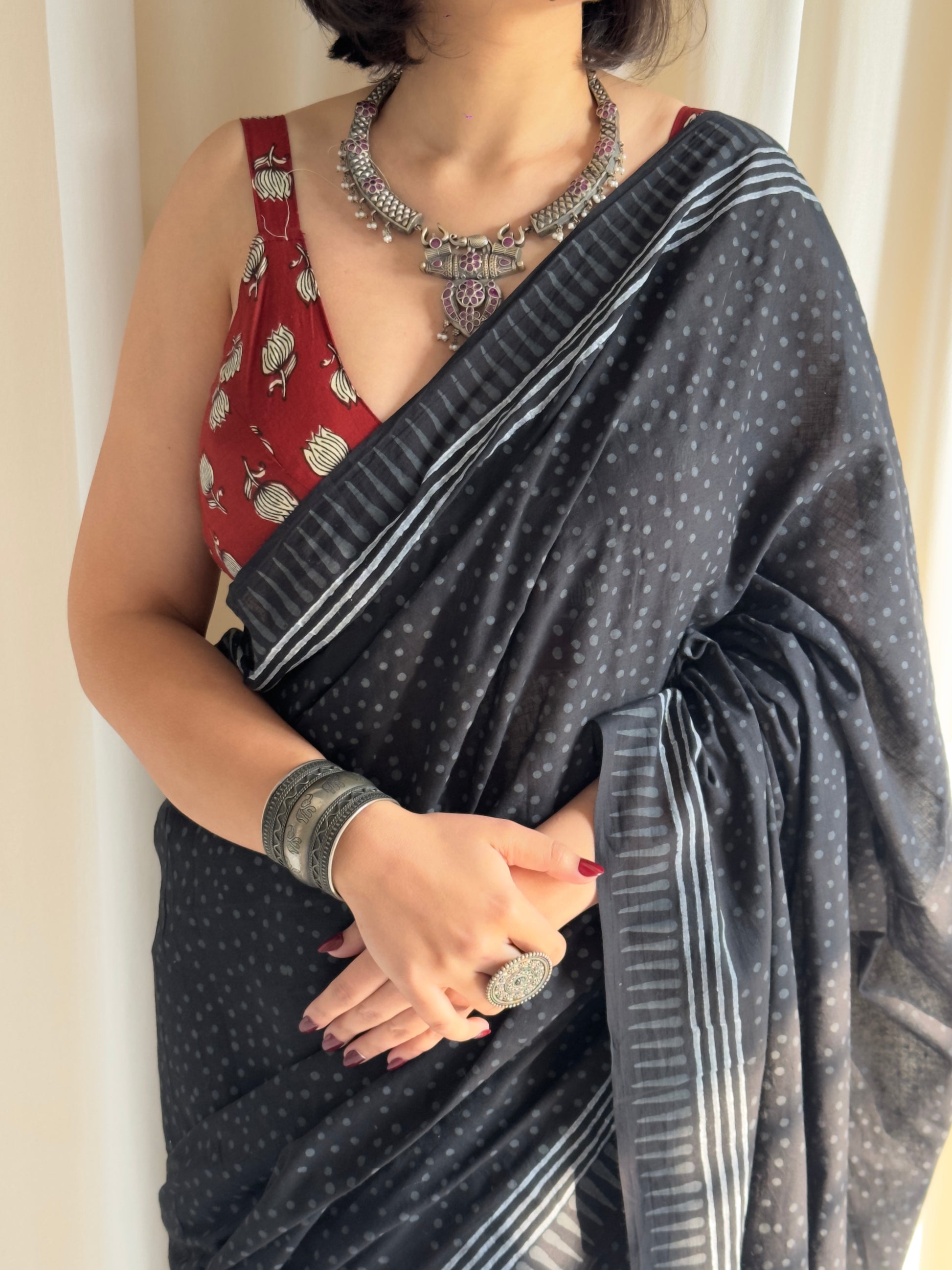 Introducing Tara - your go-to saree that effortlessly transitions from office to evening! This stunning black dotted hand block printed beauty features vibrant red tassels that add just the right amount of flair. Whether you're heading to meetings or weekend brunches, Tara brings together comfort and style in one gorgeous package. Versatile, elegant, and undeniably chic!