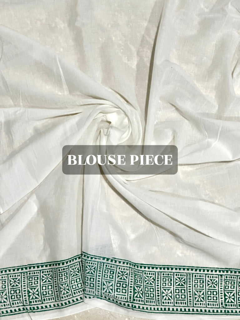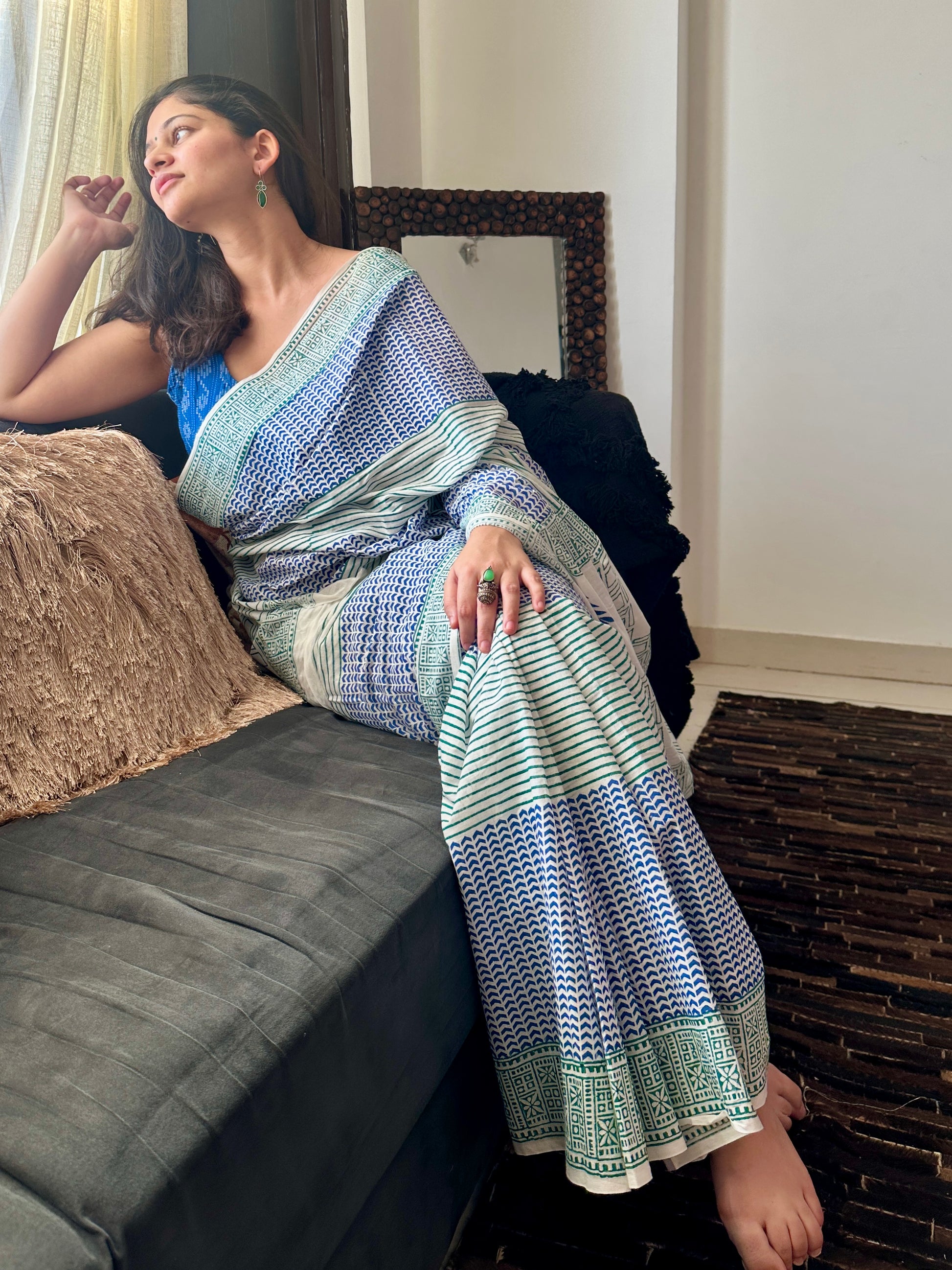 This white mul cotton saree with soft blue & green blocks running through the middle is pure “comfort meets class.” Lightweight, breathable, and oh-so-soft, it’s made for busy mornings, coffee runs, and endless meetings.