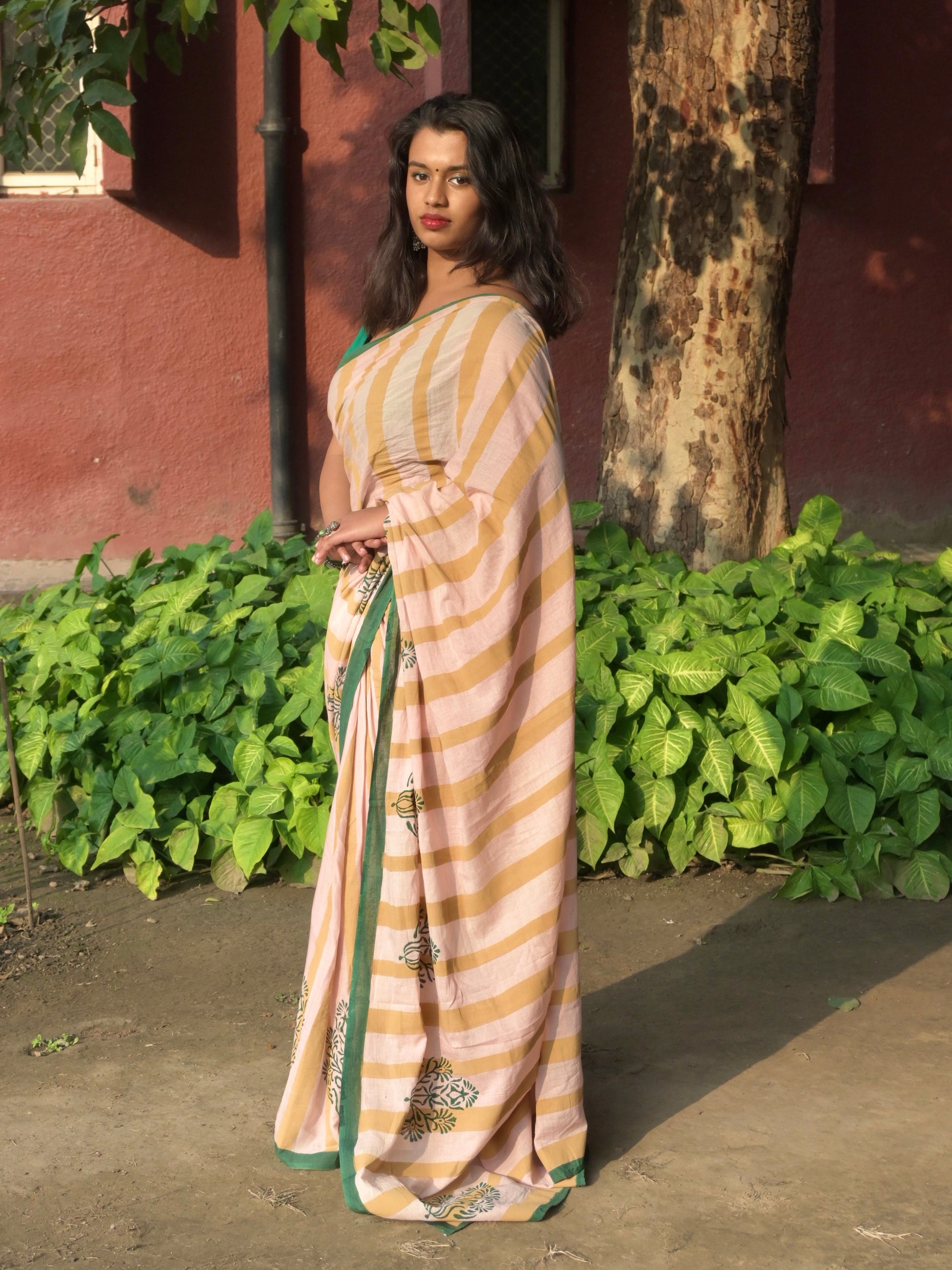 Trisha commands attention with bold modern stripes that dance across the entire canvas, anchored by an intricate Mughal block-printed that whispers heritage.