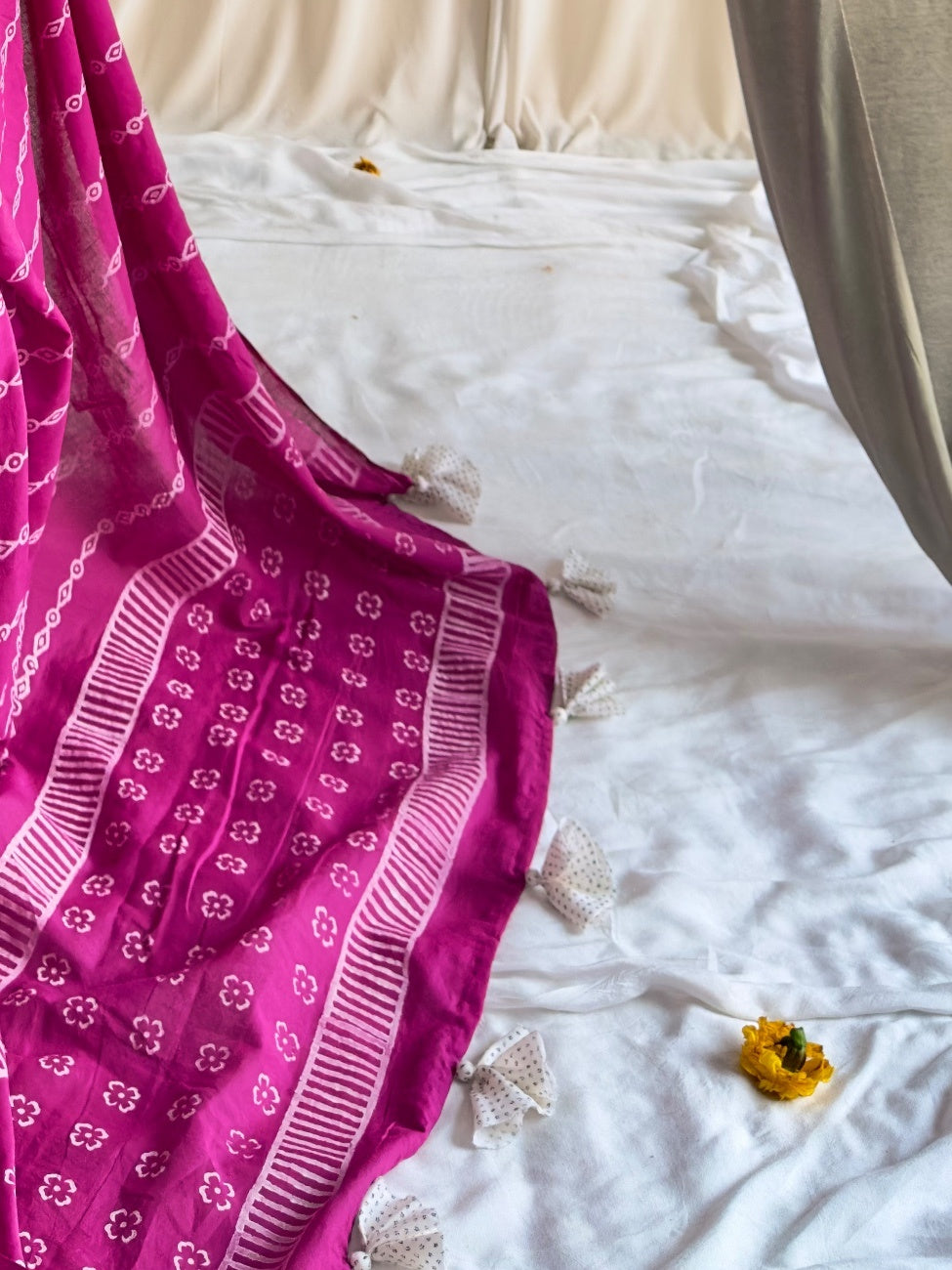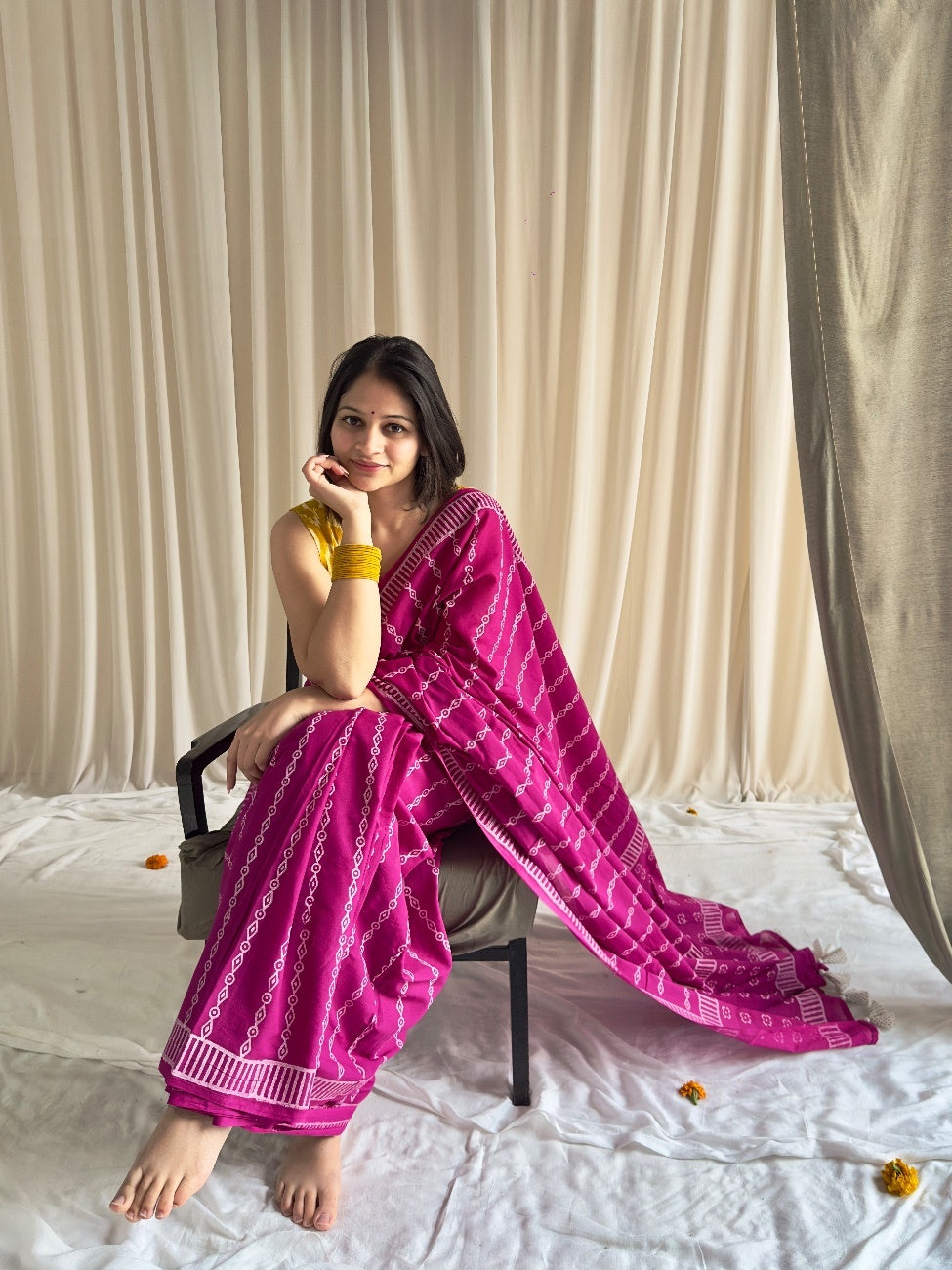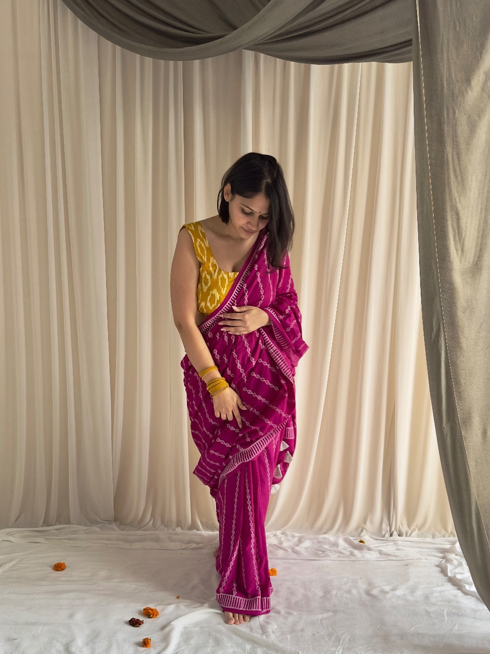 Discover Varkala – the pink cotton saree that refuses to choose between work and play! Adorned with intricate hand block prints across the entire fabric, this saree showcases artisanal craftsmanship at its finest. The distinctive lining adds an element of surprise and elegance that sets it apart from the ordinary.