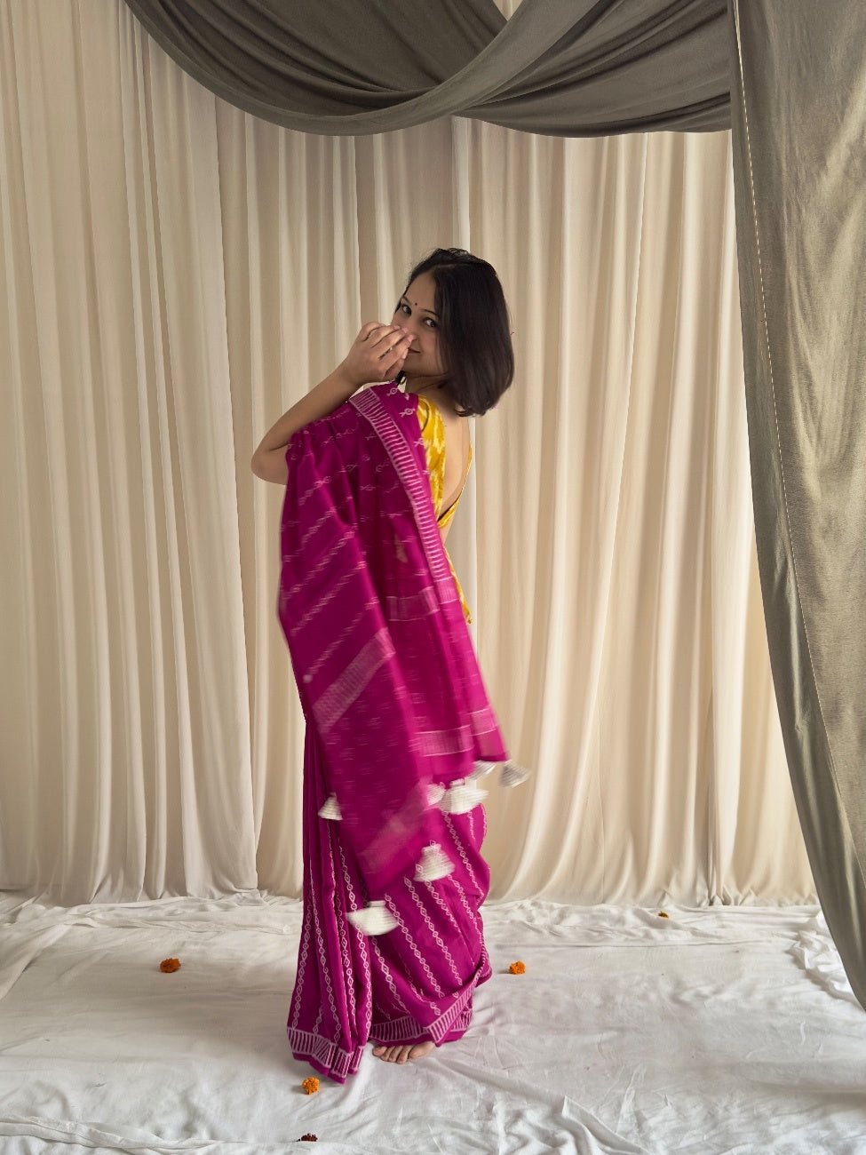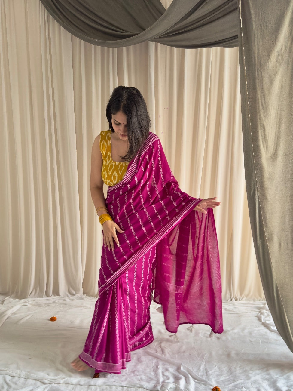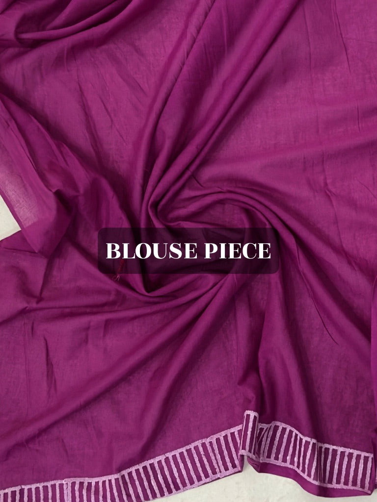 Discover Varkala – the pink cotton saree that refuses to choose between work and play! Adorned with intricate hand block prints across the entire fabric, this saree showcases artisanal craftsmanship at its finest. The distinctive lining adds an element of surprise and elegance that sets it apart from the ordinary.