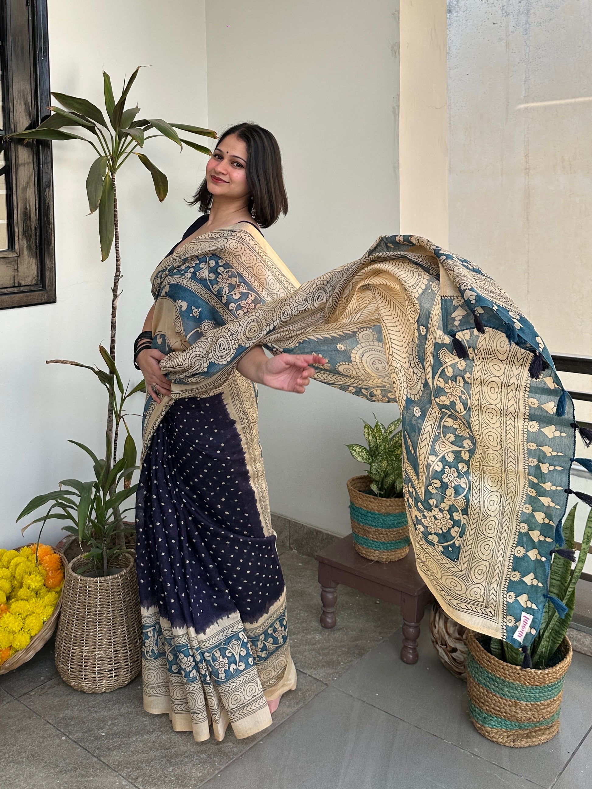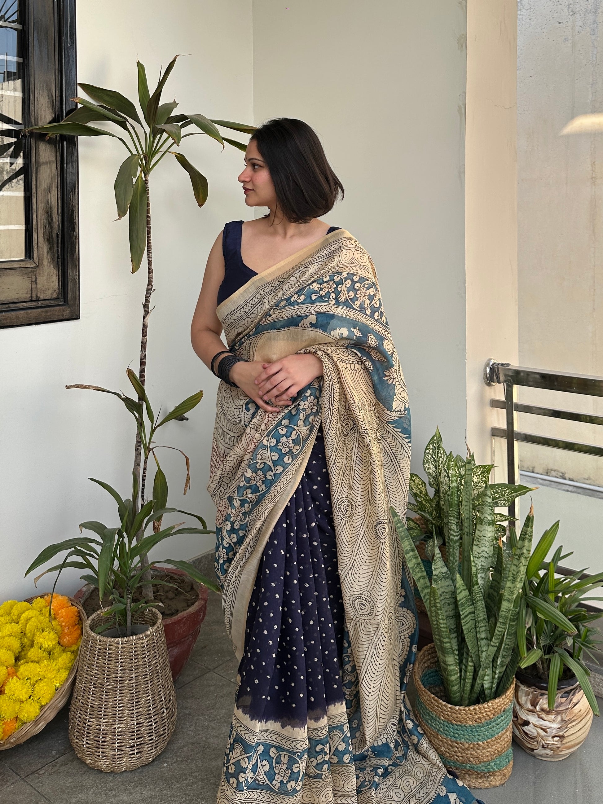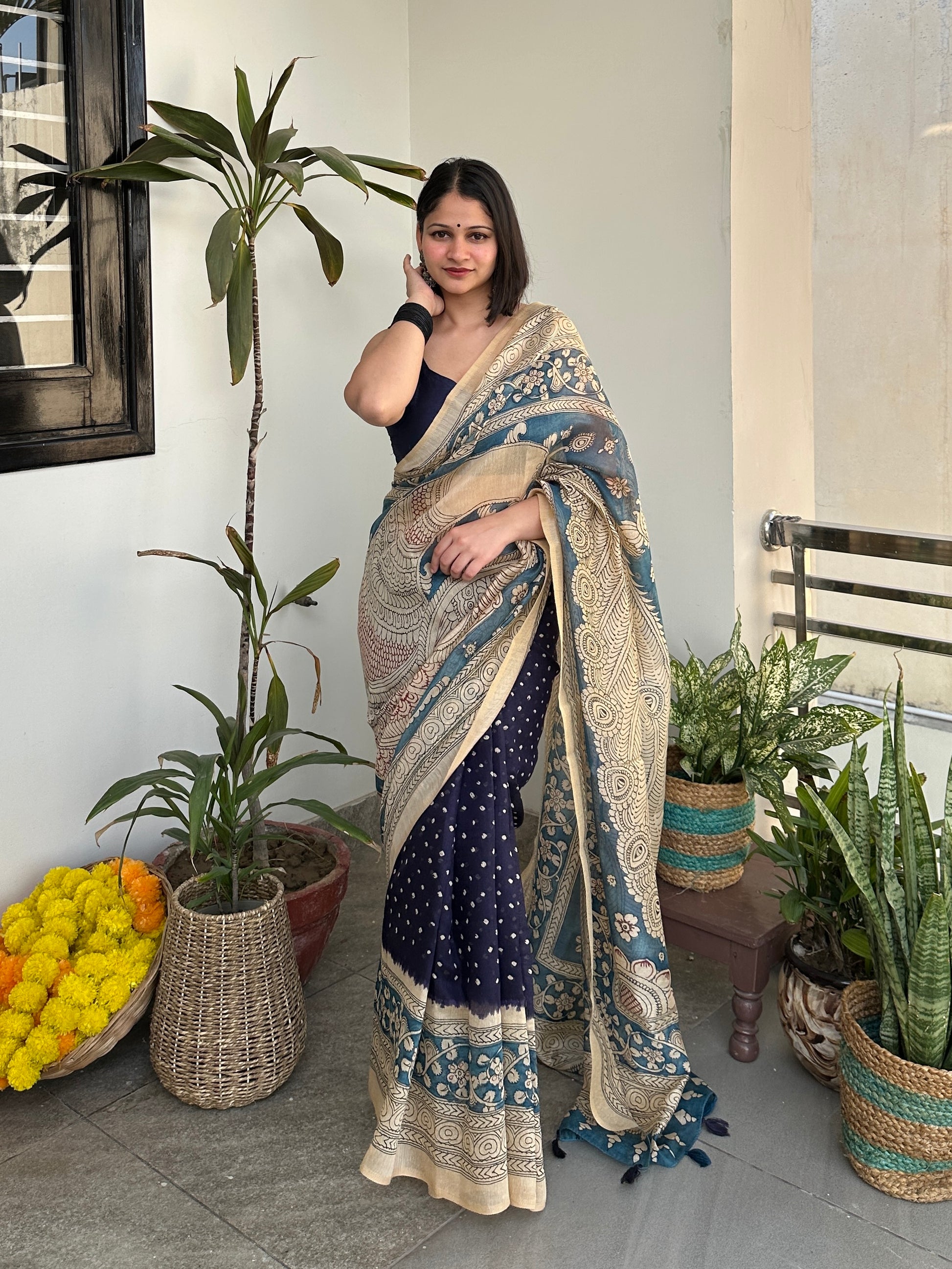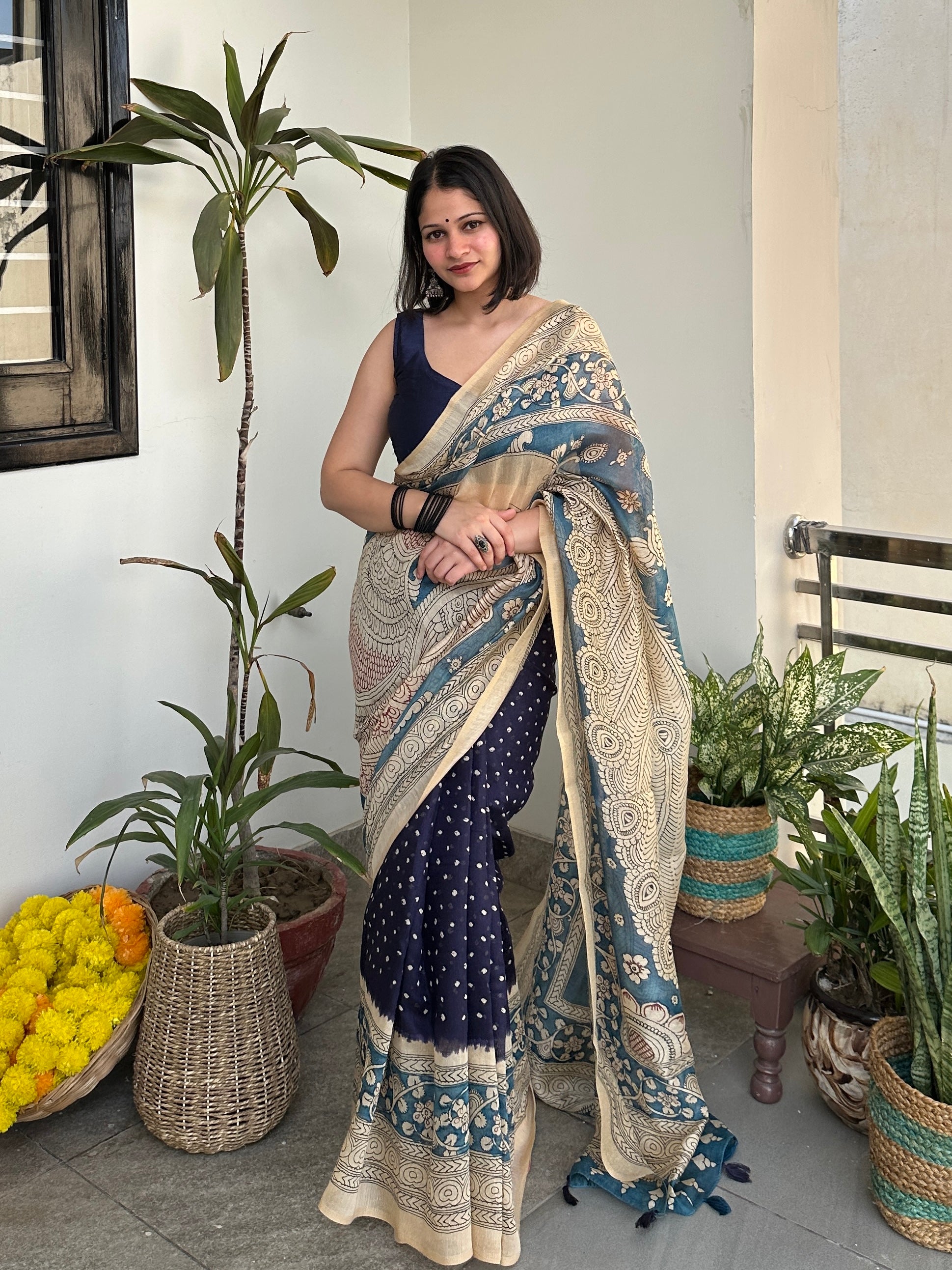 Embrace elegance with the Varnika, featuring a rich navy blue bandhej print and stunning Kalamkari printed pallu. Handcrafted on premium chanderi cotton fabric, this saree exudes traditional charm with a modern touch.