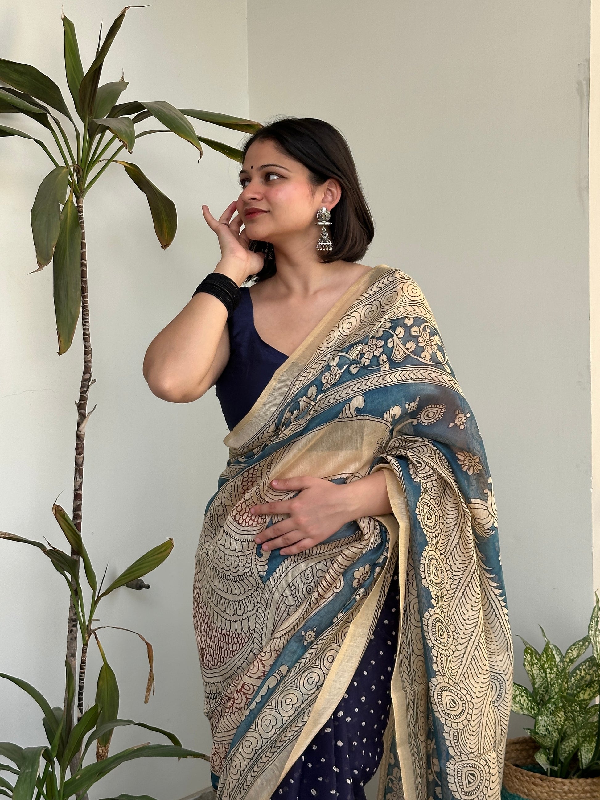 Embrace timeless elegance with the Varnika Saree – a masterpiece of navy-blue handloom fabric adorned with intricate kalmakari art on half body. This sustainable drape exudes earthy sophistication, making it perfect for cultural events, festivities, and heritage fashion lovers.